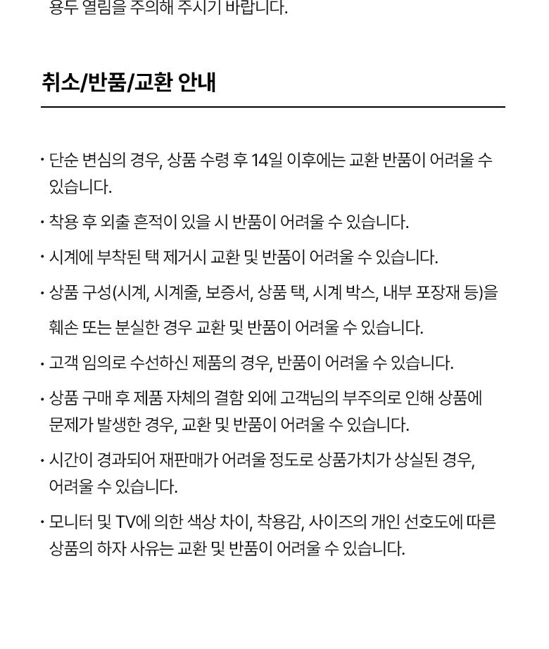 - 상품 구성(시계, 시계줄, 보증서, 택, 시계 박스, 내부 포장재 등)을훼손 또는 분실한 경우 교환 및 반품이 어려울 수 있습니다.