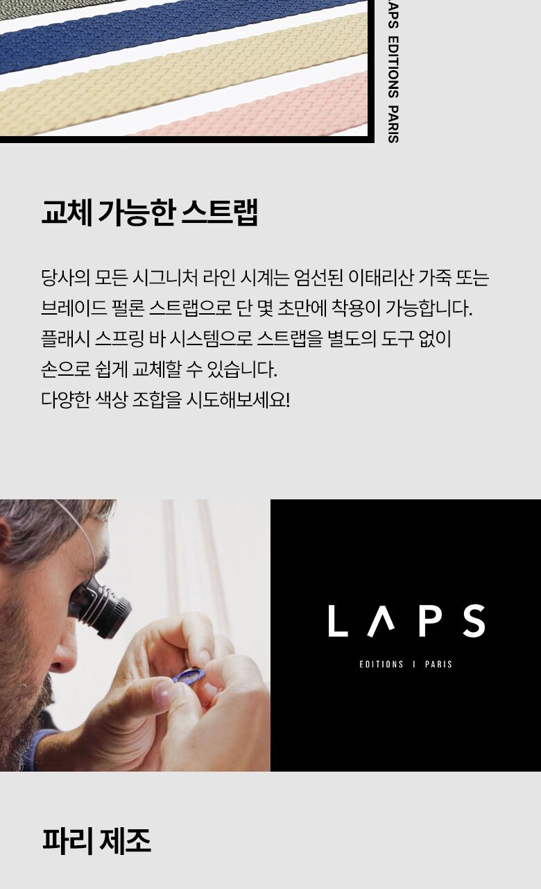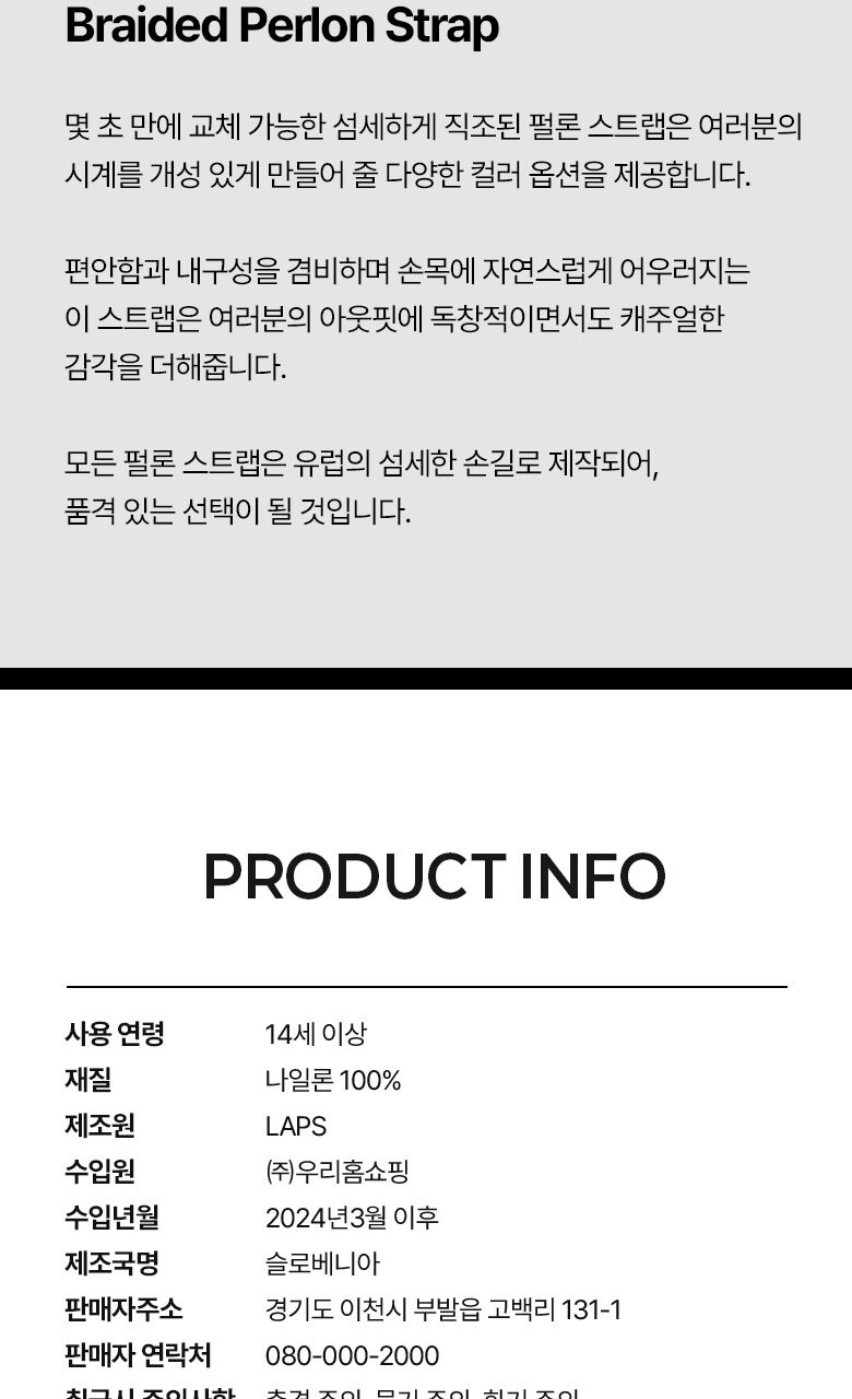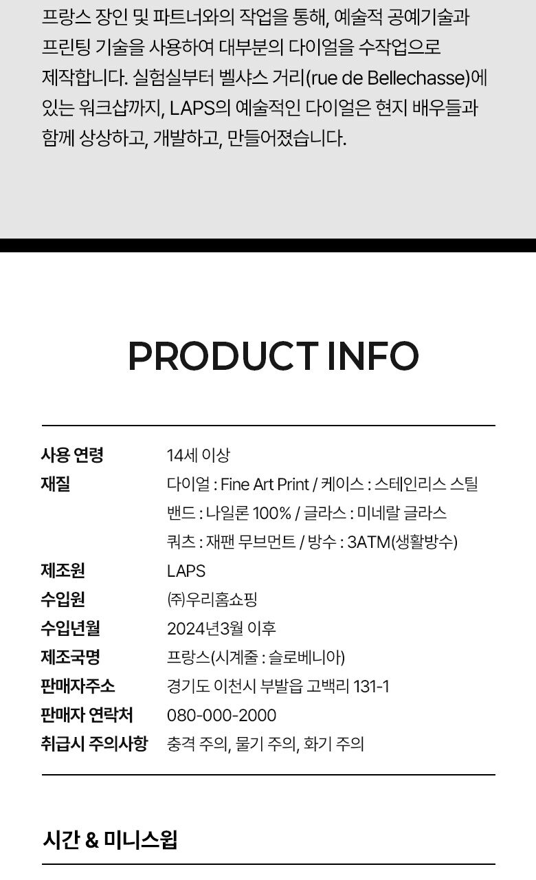 | 소재/순도/밴드재질(시계) | 다이얼 : Fine Art Print / 케이스 : 스테인리스 스틸 / 밴드 : 나일론 100% / 글라스 : 미네랄글라스 |