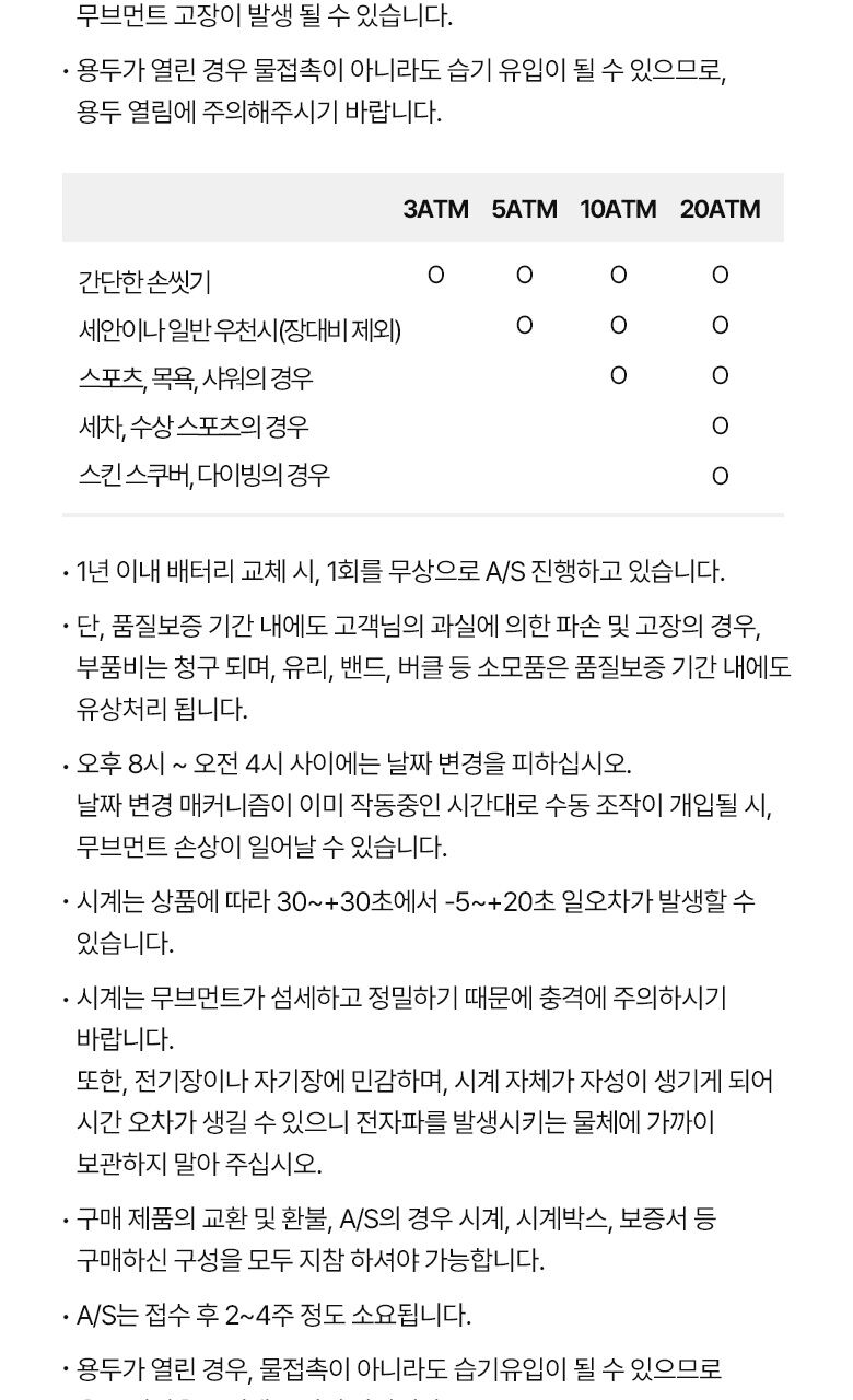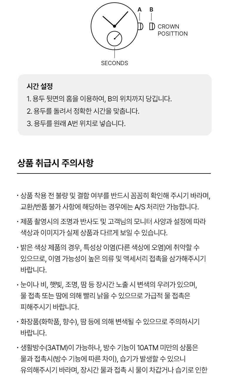 - 생활방수(3ATM)이 가능하나, 방수 기능이 10ATM 미만의 상품은 물과 접촉시(방수 기능에 따른 차이), 습기가 발생할 수 있으니 유의해주시기 바라며, 장시간 물과 접촉 시 물이 차갑거나 습기로 인한 무브먼트 고장이 발생 될 수 있습니다.