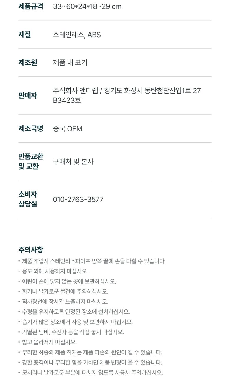- 제품 조립시 스테인리스파이프 양쪽 끝에 손을 다칠 수 있습니다.