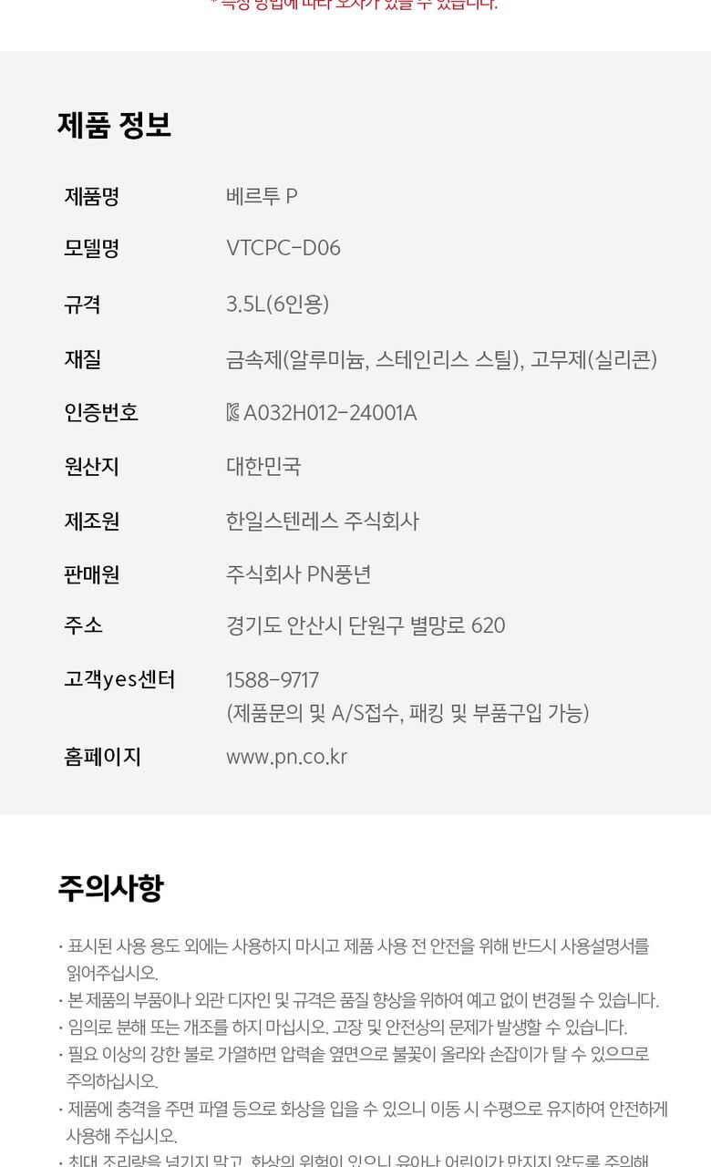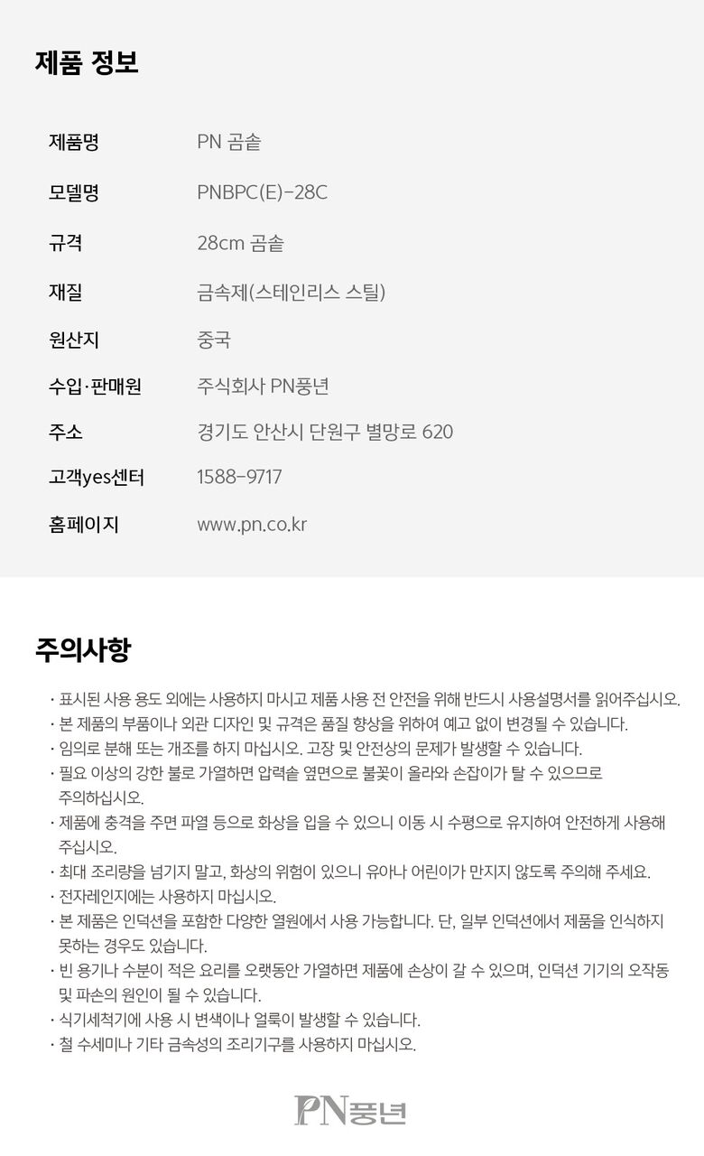 | 제조자 / 수입여부 | 풍년 OEM / ㈜PN풍년 |
