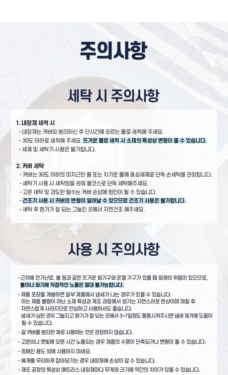 - 건조기 사용 시 커버의 변형이 일어날 수 있으므로 건조기 사용은 불가합니다