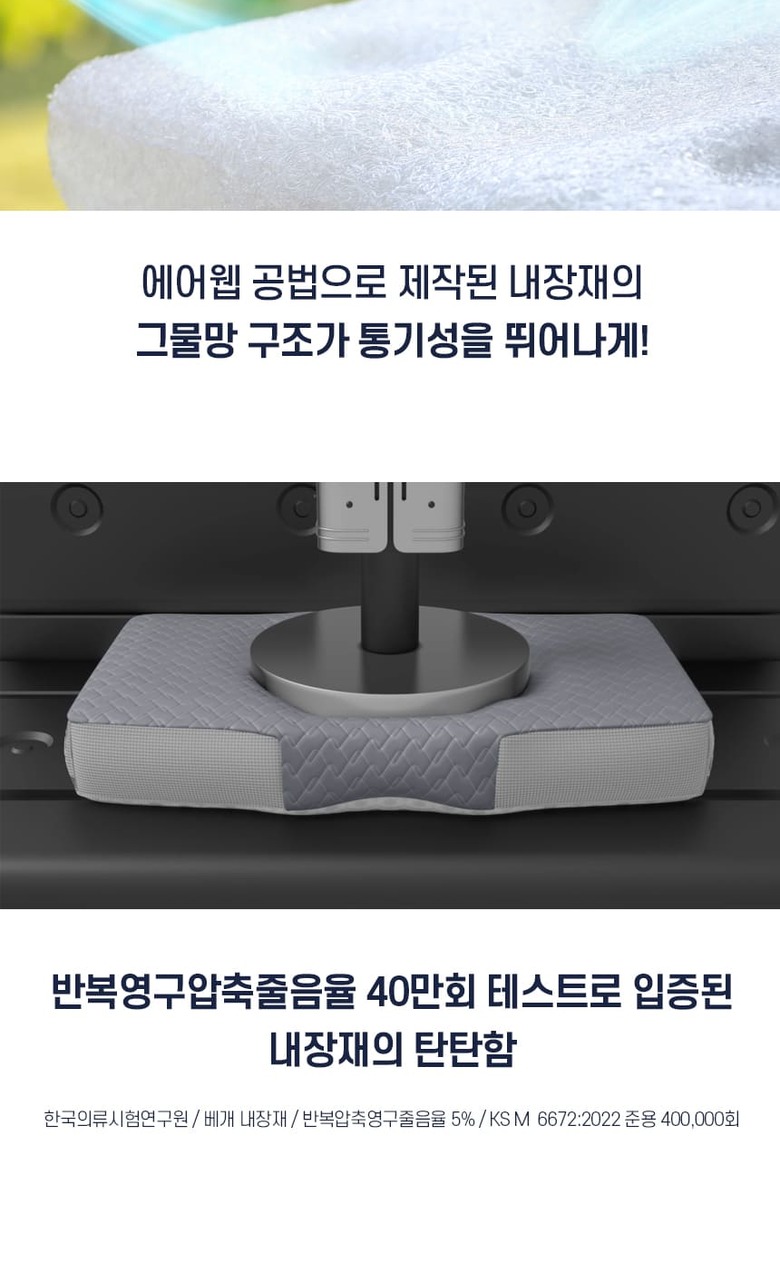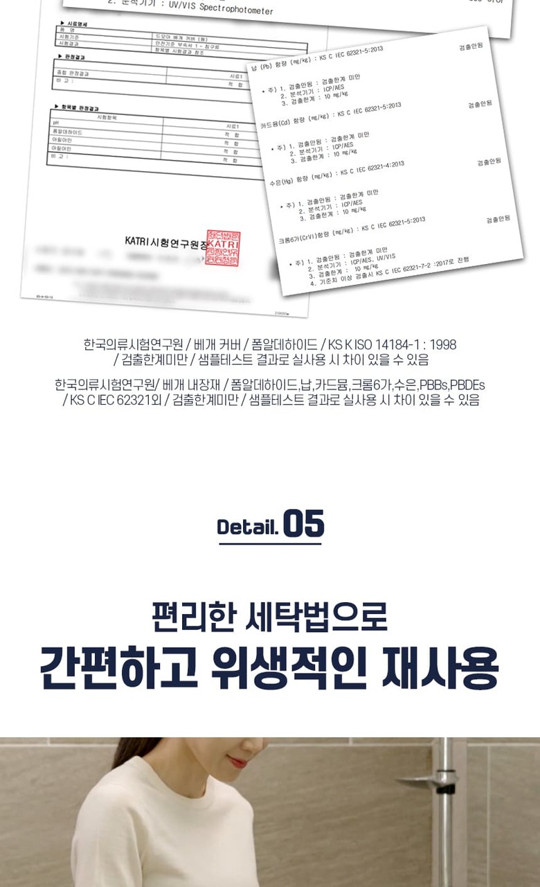 | 제품소재 | 내장재: POE (PE) / 컽커버 : 쾌적한면- 폴리에스터 57%, 폴리에틸렌43%포근한면- 폴리에스터 100% / 메쉬: 폴리에스터 100% / 속커버: 폴리에스터 100% |