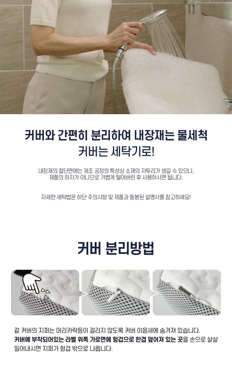 - 커버는 30도 이하의 미지근한 물 또는 차가운 물에 중성세제로 단독 손세탁을 권장합니다
