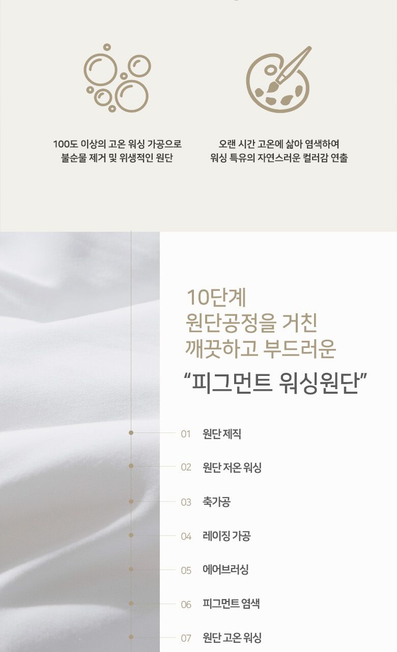| 세탁방법, 취급시 주의사항 | 1. 중성세제를 사용하여 세탁하는 것이 좋으며, 세탁온도가 30도 이상일 경우 원단의 수축 현상이 일어날 수 있기 때문에 각별히 주의해야 합니다. 2. 진한 컬러 제품의 경우, 절대 장시간 물에 담그지 마시고, 표백제나 염색제는 사용하지 말아주십시오. 3. 요즘 많이 사용되는 드럼세탁기의 건조코스는 사용하지 않는 편이좋습니다. 4. 탈수 시간은 짧게 하여 원단의 구김이 생기지 않도록 주의하여야 하며 탈수 후에는 그늘에서 바로 건조합니다. 5. 세탁조에 원단이 걸린 상태로 세탁 시, 검게 그을림, 찢어짐 등의 손상이 발생할 수 있으니 반드시 세탁 전에 세탁물에 물을 충분히 묻히거나 세탁망을 사용하여 울코스로 세탁하시면 제품의 마모 및 손상을 방지할 수 있습니다. |