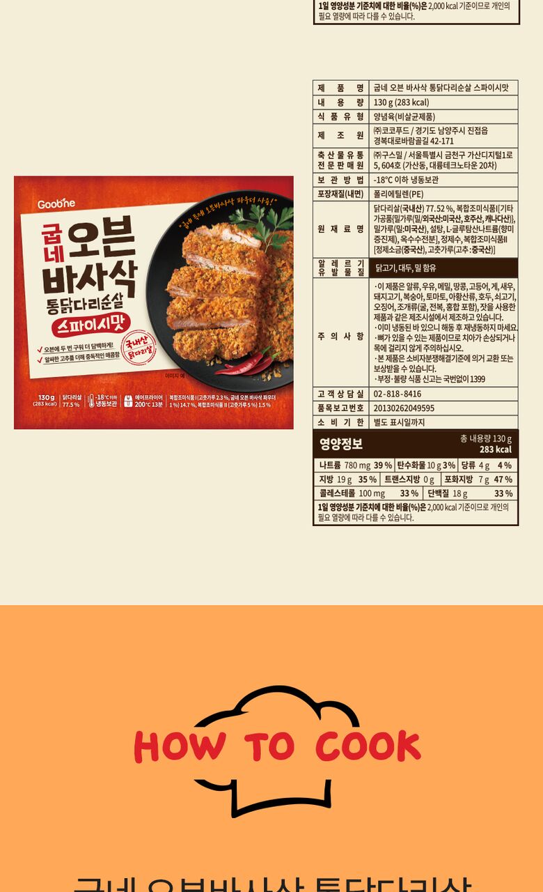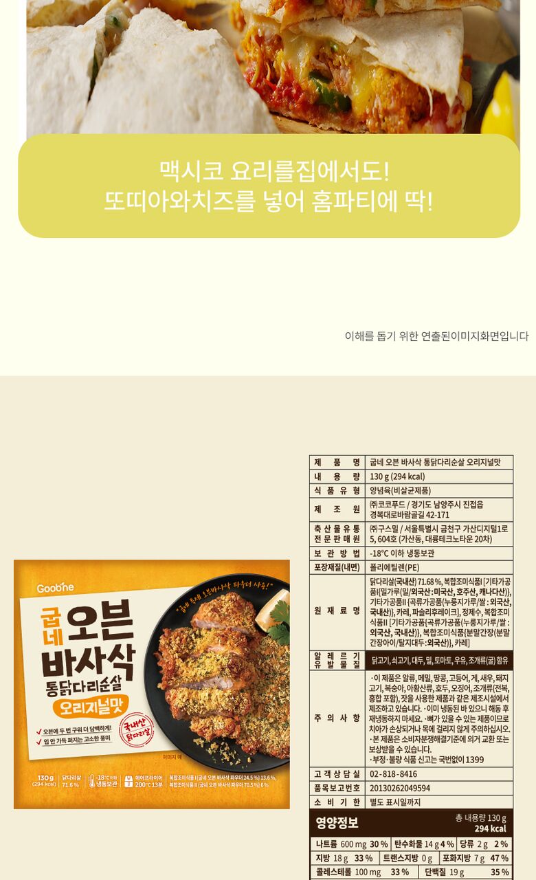| 포장단위별 내용물의 용량(중량), 수량 | ■굽네 오븐 바사삭 오리지널 130g X 5팩 / ■굽네 오븐 바사삭 스파이시 130g X 7팩 |