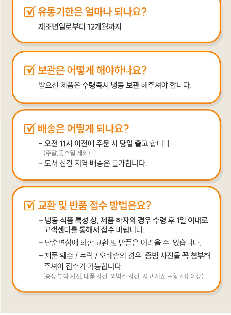 ※ 신선식품(냉장,냉동식품 포함)의 상품 특성상 배송이 시작되면 취소/반품이 어려울 수 있습니다.(단, 상품 불량인 경우 제외)