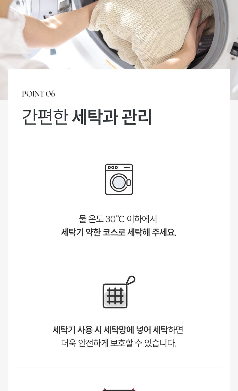 * 물의 온도 30℃에서 세탁기로 약하게 세탁 또는 손세탁 하세요.
