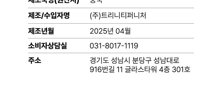 | 제조자 / 수입여부 | ㈜트리니티퍼니처 / 중국/(주)트리니티퍼니처 |