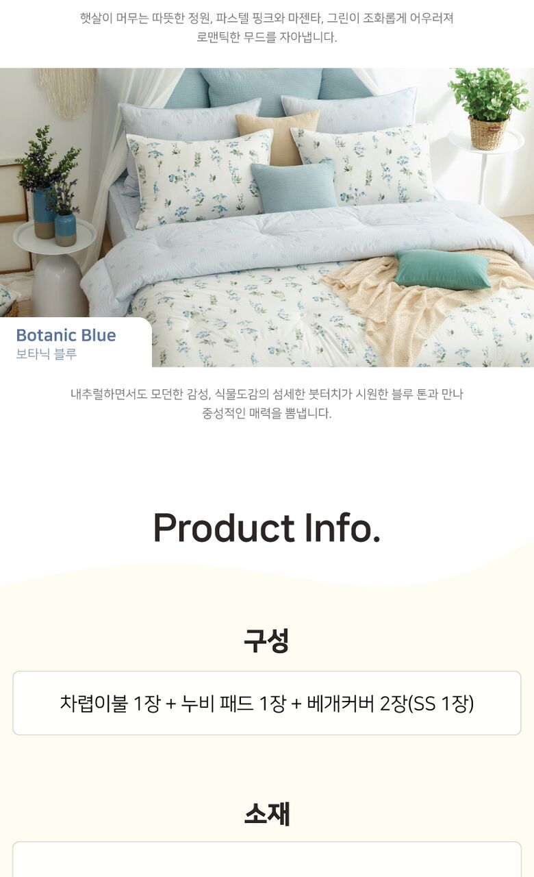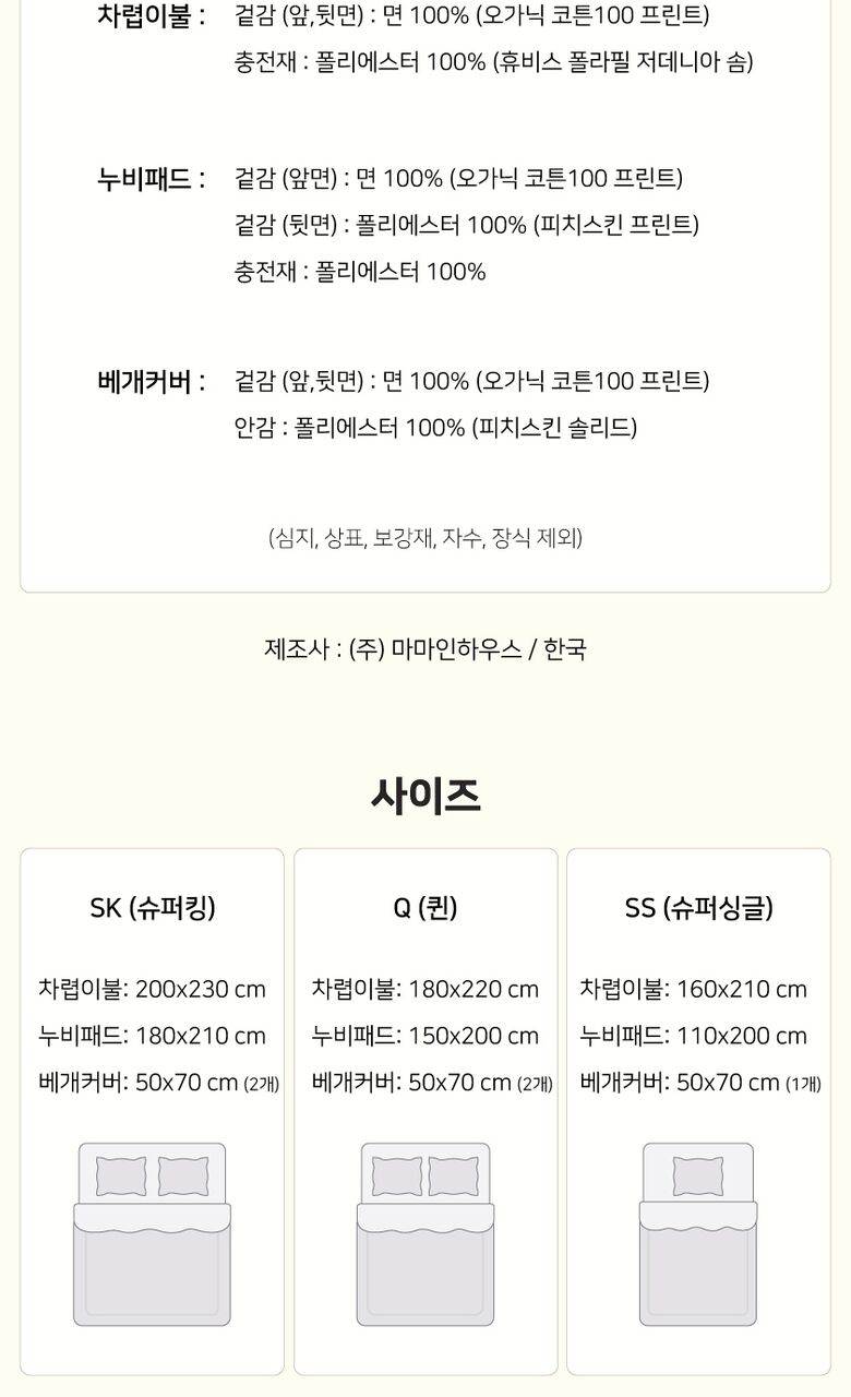 | 제품소재 | [이불]겉감1,2: 면100%, 충전재: 폴리에스터100% [패드] 겉감1: 면100%, 뒷면: 폴리에스터100%, 충전재: 폴리에스터100% [베개커버]겉감: 면100% 안감: 폴리에스터 100% |