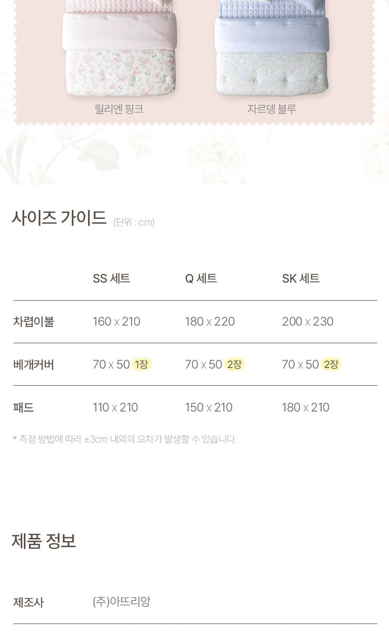 | 치수 | 이불(160*210), 패드(110*210), 베개커버(50*70) |
