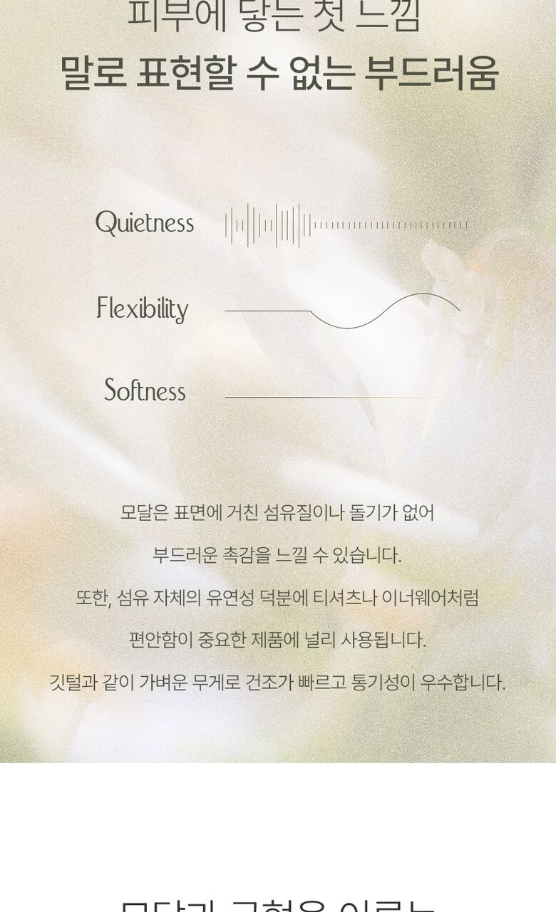 | 제품소재 | [이불]모달 100%, 충전재: 폴리에스터100% [패드] 앞면: 모달100%, 뒷면: 폴리에스터 100%, 충전재: 폴리에스터100% [베개커버] 겉감: 모달100%, 안감: 폴리에스터 100% |