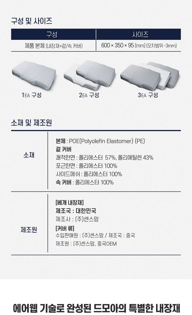 | 제조자 / 수입여부 | 센스맘 / 충전재 제조사 : (주)센스맘 / 한국겉커버/속커버 제조사 : 센스맘OEM / 중국 |