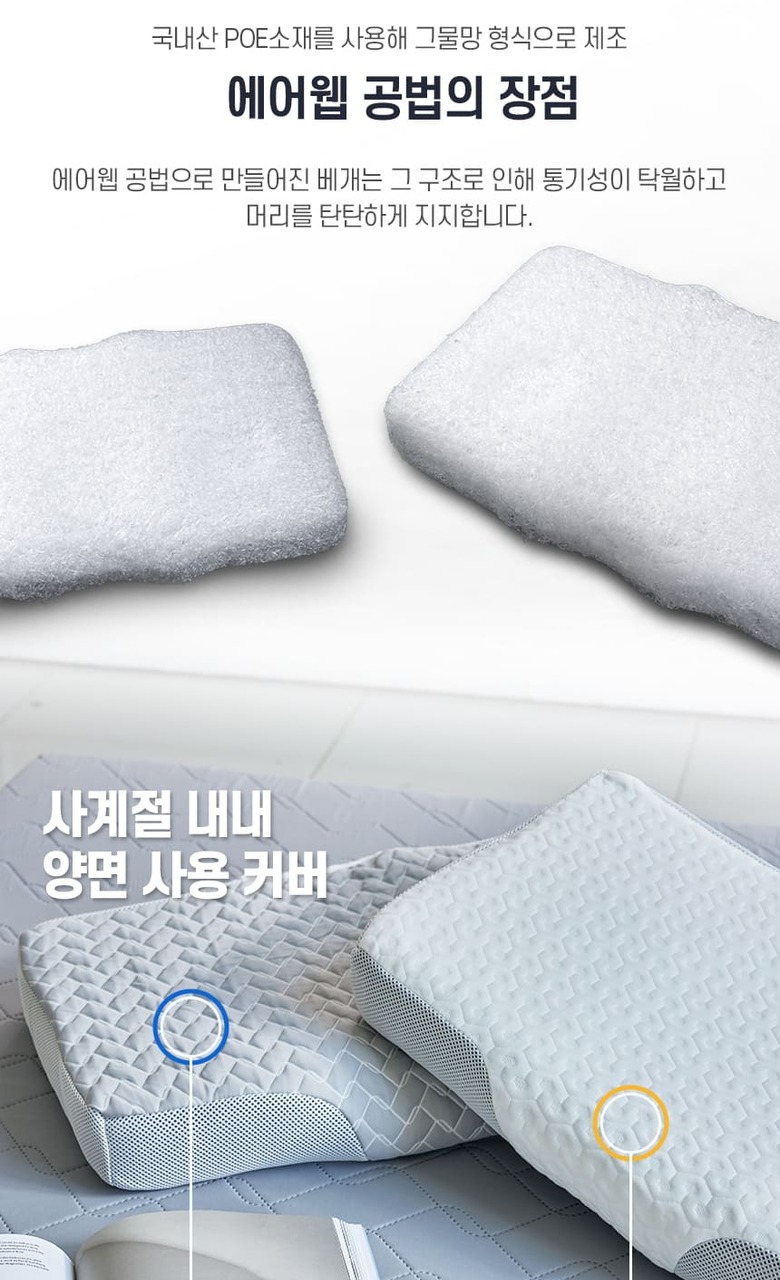 | 제품소재 | 내장재: POE (PE) / 컽커버 : 쾌적한면- 폴리에스터 57%, 폴리에틸렌43%포근한면- 폴리에스터 100% / 메쉬: 폴리에스터 100% / 속커버: 폴리에스터 100% |