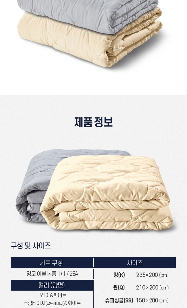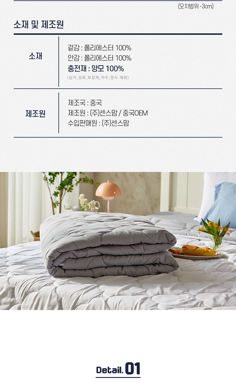 | 제품소재 | 겉감: 폴리에스터 100%, 안감: 폴리에스터 100%, 충전재: 양모 100% |