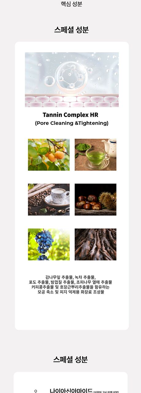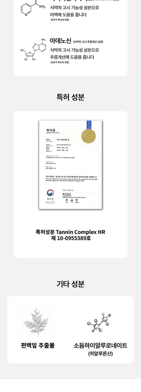 | 화장품법에 따라 기재·표시하여야 하는 모든 성분 | 정제수, 나이아신아마이드, 글리세린, 다이프로필렌글라이콜, 부틸렌글라이콜, 카카두플럼추출물, 소듐폴리스타이렌설포네이트, 말토덱스트린, 베타인, 스피룰리나 플라텐시스추출물, 바다포도추출물, C12-13알케스-9, 스페인감초뿌리추출물, 감나무잎추출물, 뽕나무껍질추출물, 코치닐선인장열매추출물, 측백나무잎추출물, 초피나무열매껍질추출물, 호장근뿌리추출물, 블랙체리열매추출물, 모과추출물, 왕귤추출물, 감추출물, 병풀추출물, 소듐하이알루로네이트, 아데노신, 카보머, 1,2-헥산다이올, 토코페릴아세테이트 트리에탄올아민, 에틸헥실글리세린, 클로페네신, 카프릴릴글라이콜, 다이소듐이디티에이, 향료, 리모넨 |