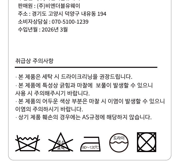| A/S 책임자/전화번호 | (주)비엔더블유웨이 / 070-5100-1239 |