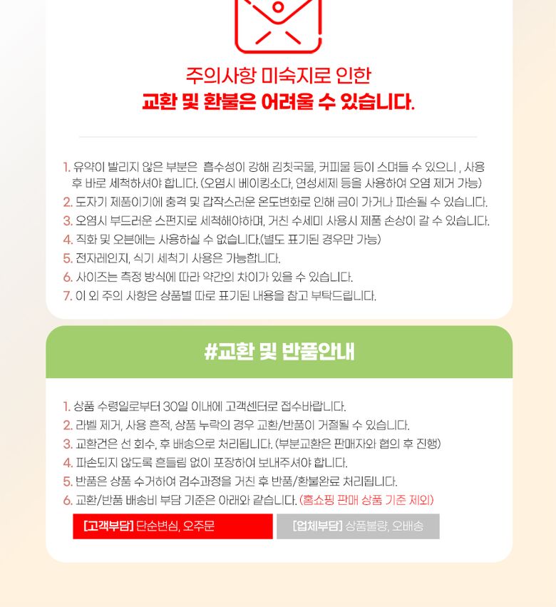 | 상품의 하자, 오배송 | 상품수령 후 3개월 이내, 혹은 그 사실을 알 수 있었던 날로부터 30일 이내 | 무료 (판매자 부담) |