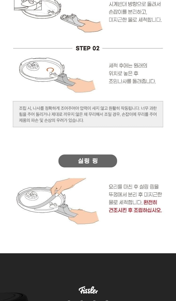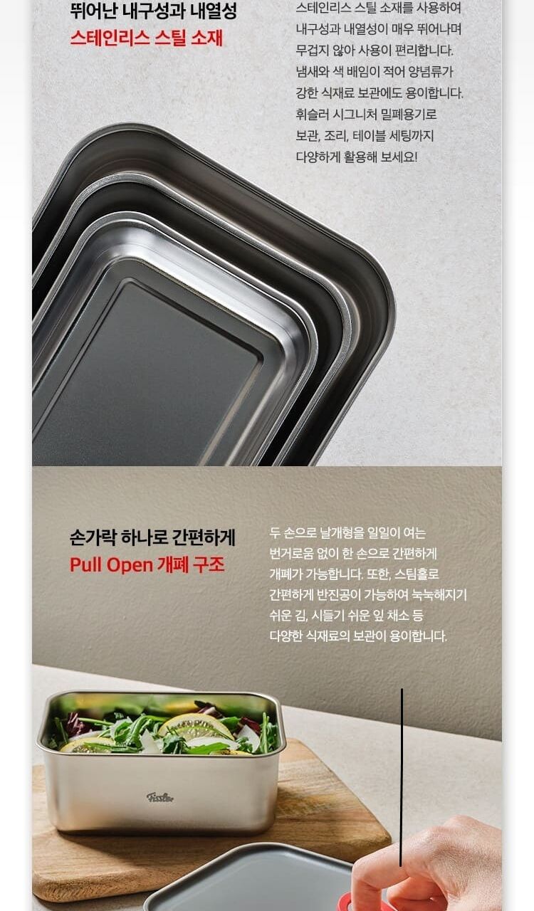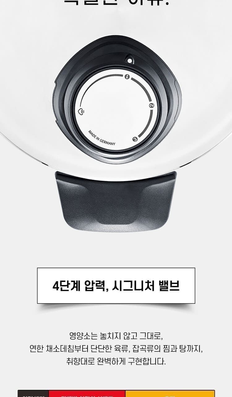 | 재질 | 압력솥: 스테인리스스틸, 고무제 / 스텐밀폐용기: 뚜껑(폴리프로필렌), 패킹(실리콘), 바디(스테인리스 스틸)/ 믹싱볼, 주걱: 스테인리스스틸 |