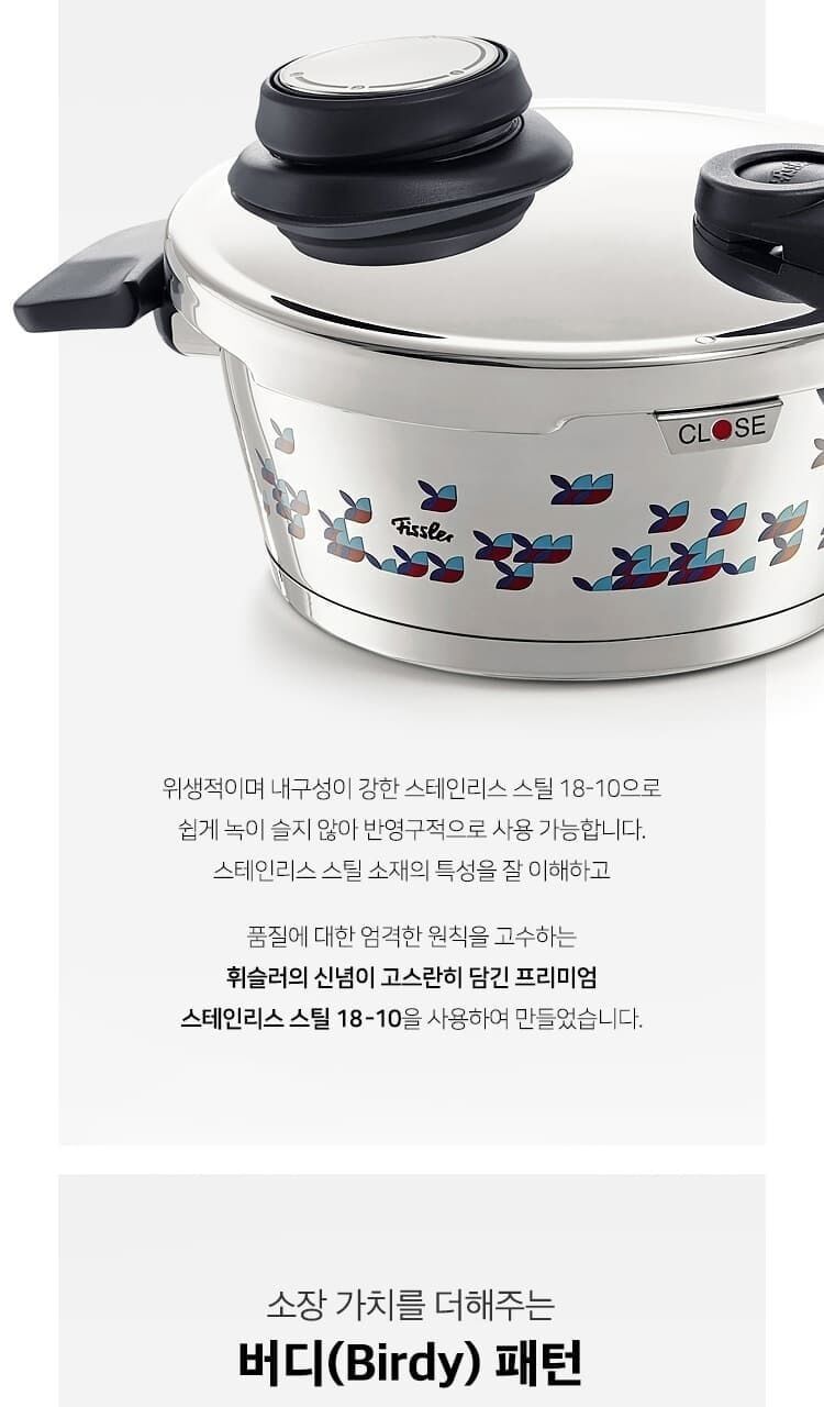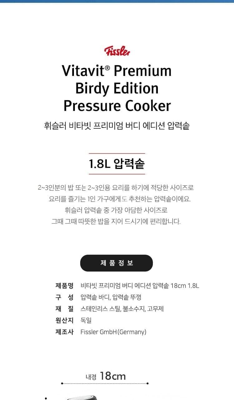 | 구성품 | 비타빗 프리미엄 버디 압력솥 1.8L + 스텐 밀폐용기 5종 + 믹싱볼 3종 + 스텐 주걱 |