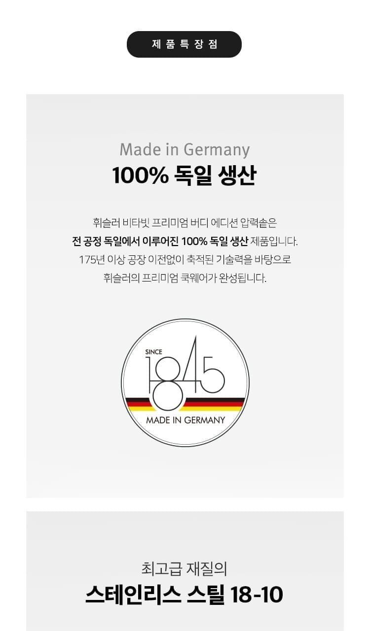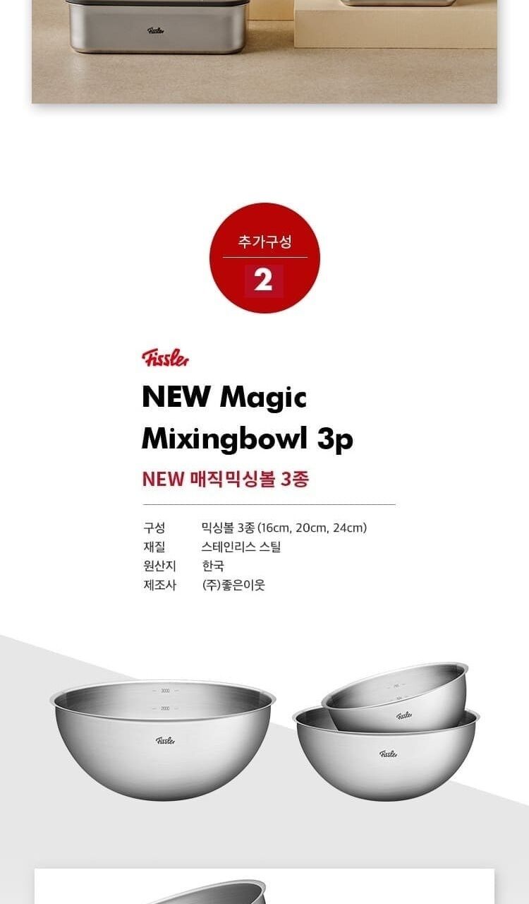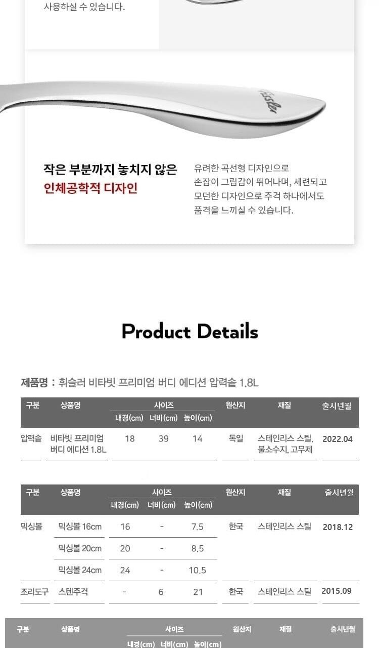 | 제조자 / 수입여부 | 휘슬러 / 압력솥 : 독일 (수입원 : 휘슬러 코리아), 밀폐용기: 중국, 믹싱볼/주걱: 한국 |