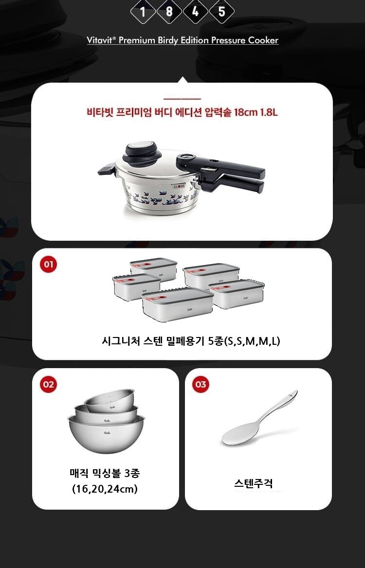 [휘슬러]비타빗 프리미엄 버디 압력솥 1.8L + 스텐 밀폐용기 5종 + 믹싱볼 3종 + 스텐 주걱