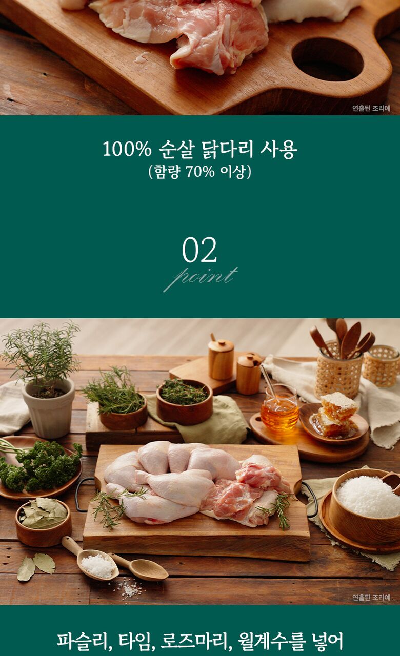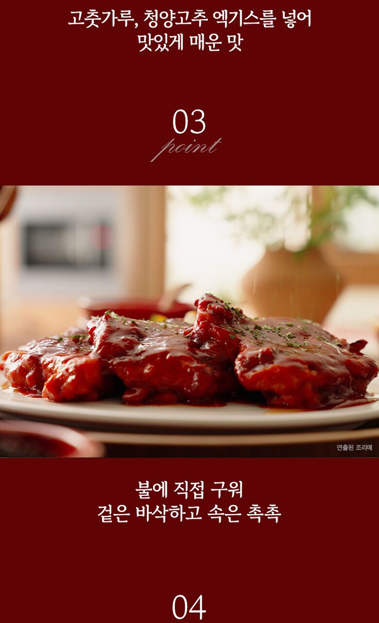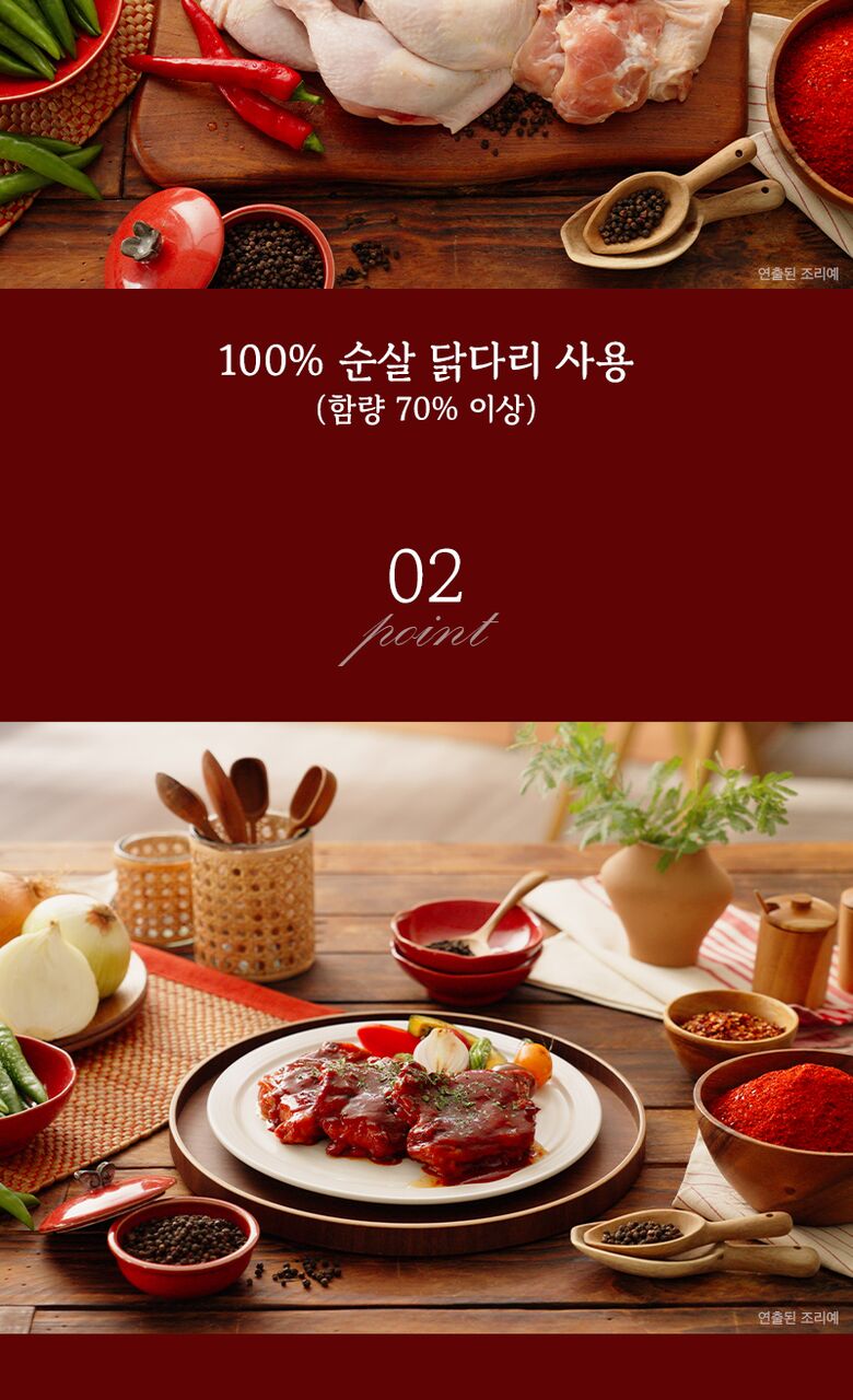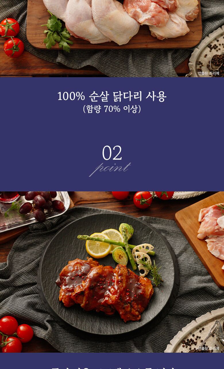 | 원재료명 및 함량(원산지) | ■허브솔트맛: 닭다리살(외국산:브라질,태국,미국 등)79.05%,소스[천일염(국산),사양벌꿀(국산),파슬리후레이크(네덜란드),흑후추분태,마늘,타임분말(튀르키예산),로즈마리분말(모로코),월계수잎분말(튀르키예)]19.76%,전분가공품[감자전분(폴란드)],혼합제제(폴리인산나트륨,피로인산나트륨,산성피로인산나트륨) * 닭고기 함유 ■특제매콤(청양매콤)맛: 닭다리살(외국산:브라질,태국,미국 등)74.46%,소스[백설탕,양파(중국산),혼합간장{탈지대두(외국산:인도,미국,중국 등)},물엿,고춧가루]14.52%,정제수,복합조미식품[정제소금(중국산),복합조미식품{탈지대두(외국산:인도,미국,중국 등)}],전분가공품,혼합제제(폴리인산나트륨,피로인산나트륨,메타인산나트륨) * 대두, 밀, 우유, 쇠고기, 토마토, 닭고기, 조개류(굴) 함유 ■코코뱅맛: 닭다리살(외국산:브라질,태국,미국 등)74.46%,소스[소스(뉴질랜드),과실주(스페인),과채가공품,양파,과채음료]14.52%,정제수,복합조미식품[정제소금(중국산),복합조미식품{탈지대두(외국산:인도,미국,중국 등)}],전분가공품,혼합제제(폴리인산나트륨,피로인산나트륨,메타인산나트륨) * 알류, 대두, 밀, 돼지고기, 토마토, 닭고기, 쇠고기, 아황산류 함유 |
