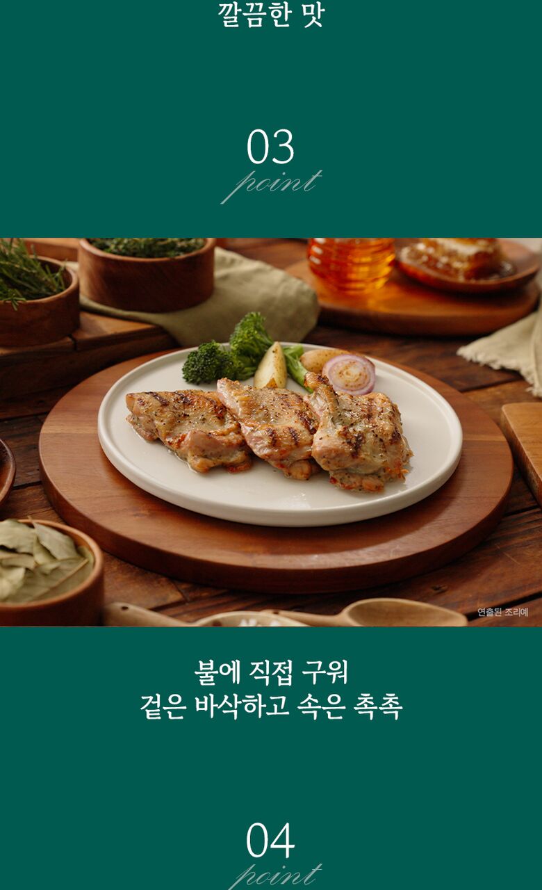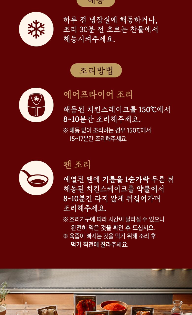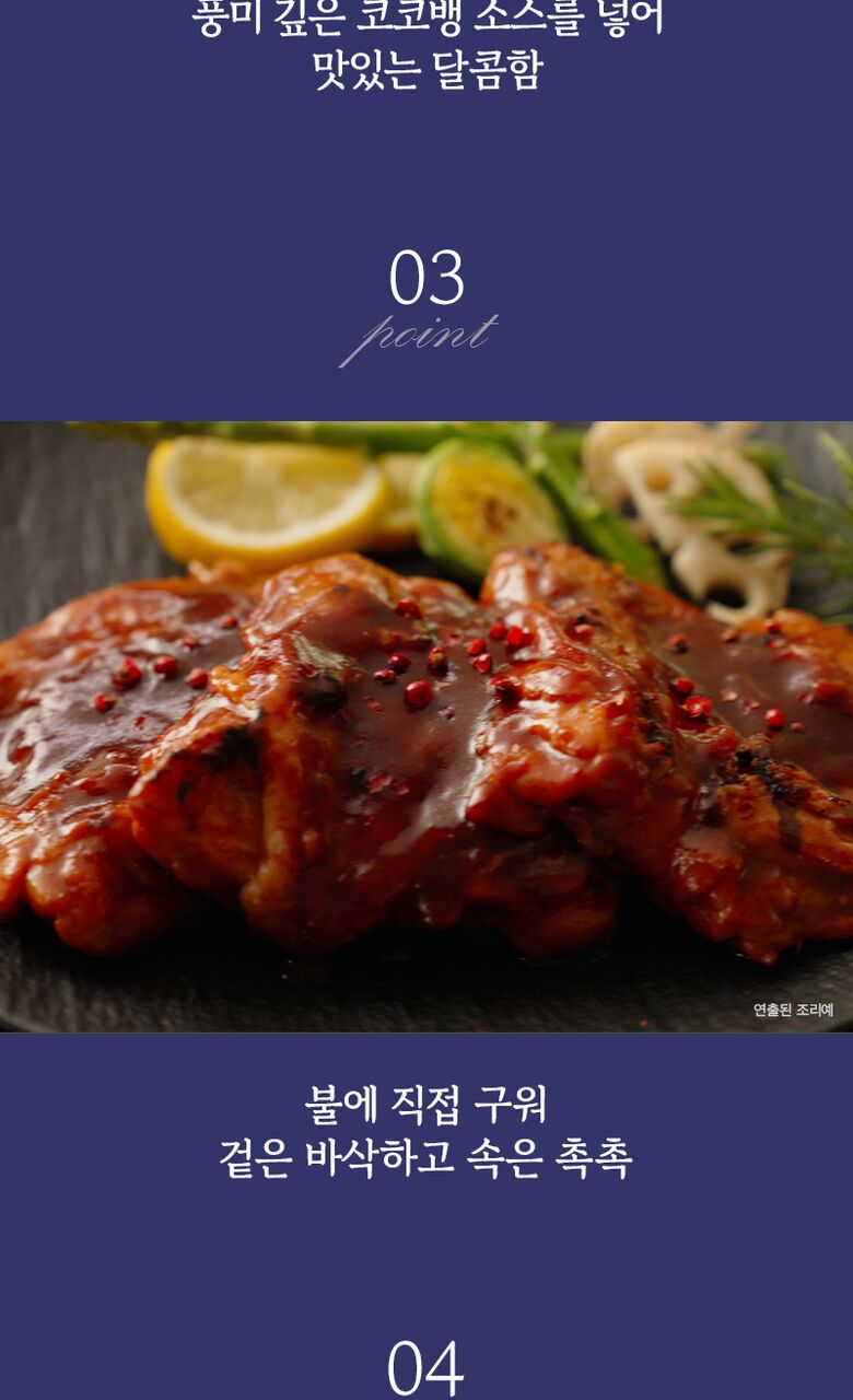 | 영양성분 | ■허브솔트맛: 총 내용량 150g, 221kcal (나트륨720mg(36%),탄수화물4g(1%),당류0g(0%),지방13g(24%),트랜스지방0g,포화지방5g(33%),콜레스테롤150mg(50%),단백질22g(40%)) / ■특제매콤(청양매콤)맛: 총 내용량 150g, 205kcal (나트륨650mg(33%),탄수화물9g(3%),당류6g(6%),지방9g(17%),트랜스지방0g,포화지방3.8g(25%),콜레스테롤120mg(40%),단백질22g(40%)) / ■코코뱅맛: 총 내용량 150g, 225kcal(나트륨950mg(48%),탄수화물5g(2%),당류4g(4%),지방13g(24%),트랜스지방0g,포화지방4.3g(29%),콜레스테롤135mg(45%),단백질22g(40%)) 1일 영양성분 기준치에 대한 비율(%)은 2,000kcal기준이므로 개인의 필요 열량에 따라 다를 수 있습니다. |