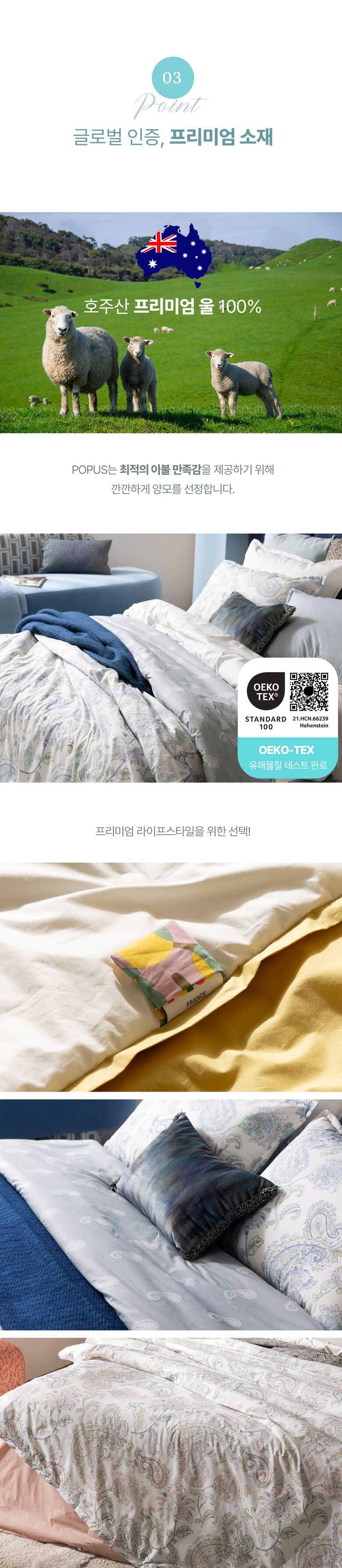 | 제품소재 | [이불] 겉면1,2: 면 100% , 충전재: 양모 100%[베개커버]겉면1,2: 면 100% , 충전재: 양모 100% 베개솜: [겉감, 충전재] 폴리에스터100% |