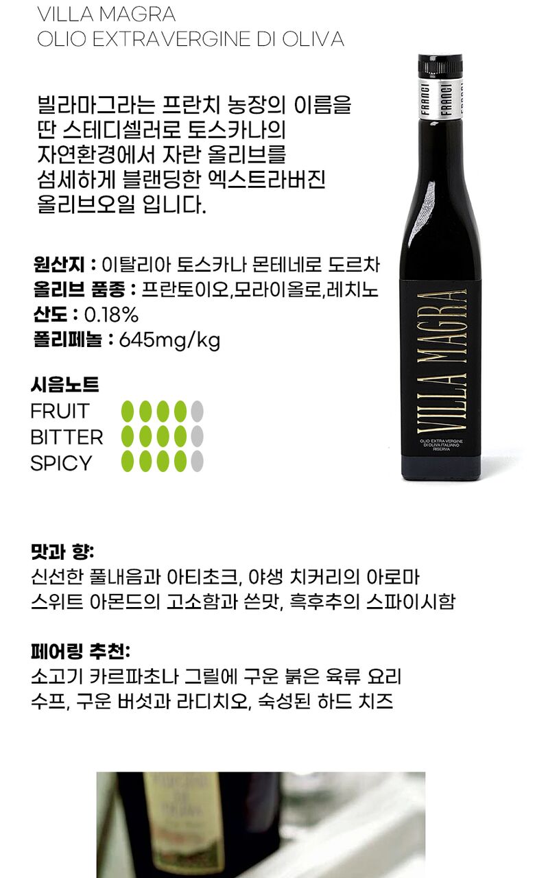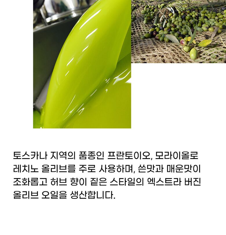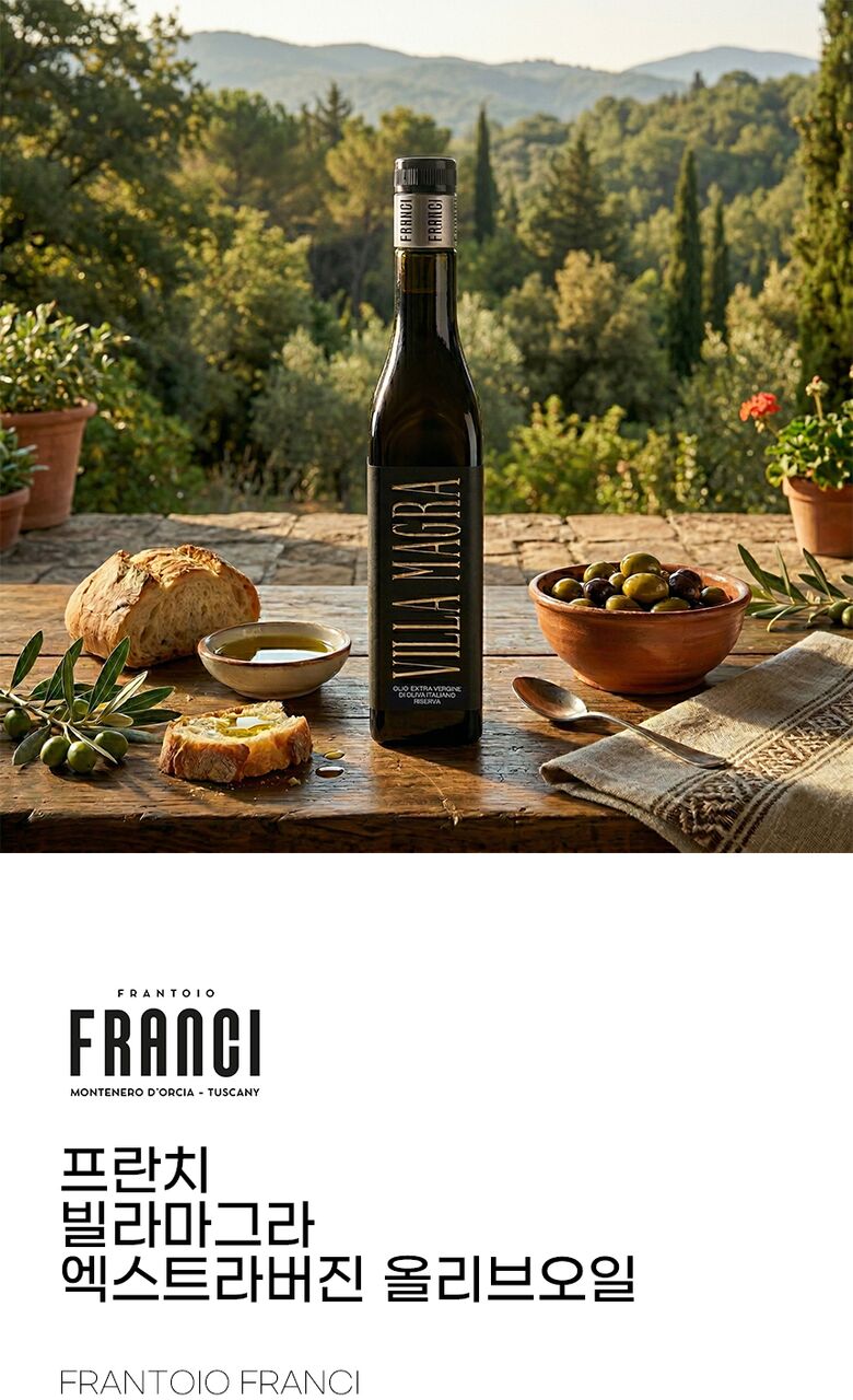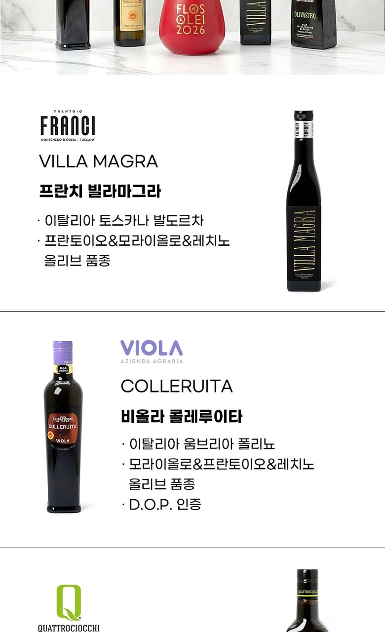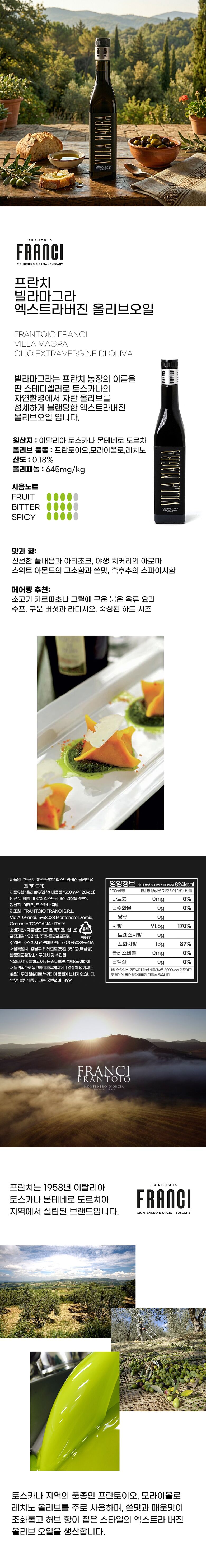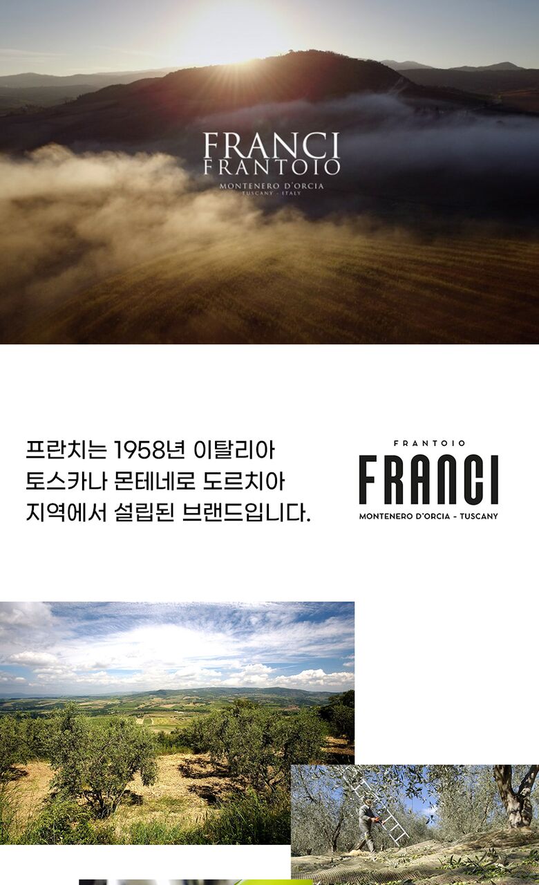 | 제조자 / 수입여부 | 프란치 / 프란치-제조원:FRANTOIO FRANCI S.R.L./ 비올라 -제조원: AZIENDA AGRARIA VIOLA SRL , 콰트로치오키-제조원:QUATTROCIOCCHI AMERICO, 보나미니-제조원:FRANTOIO BONAMINI DI BONAMINI GIANCARLO 수입사 웹기술서 표기 |