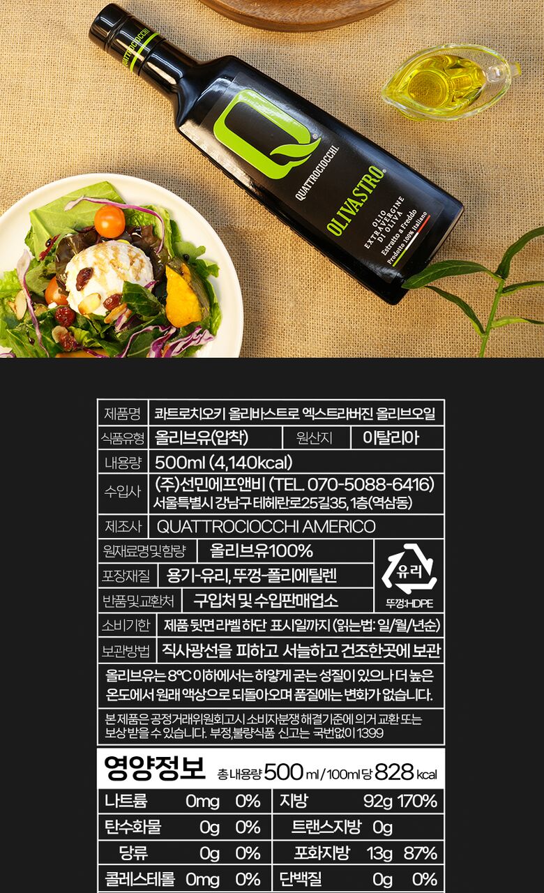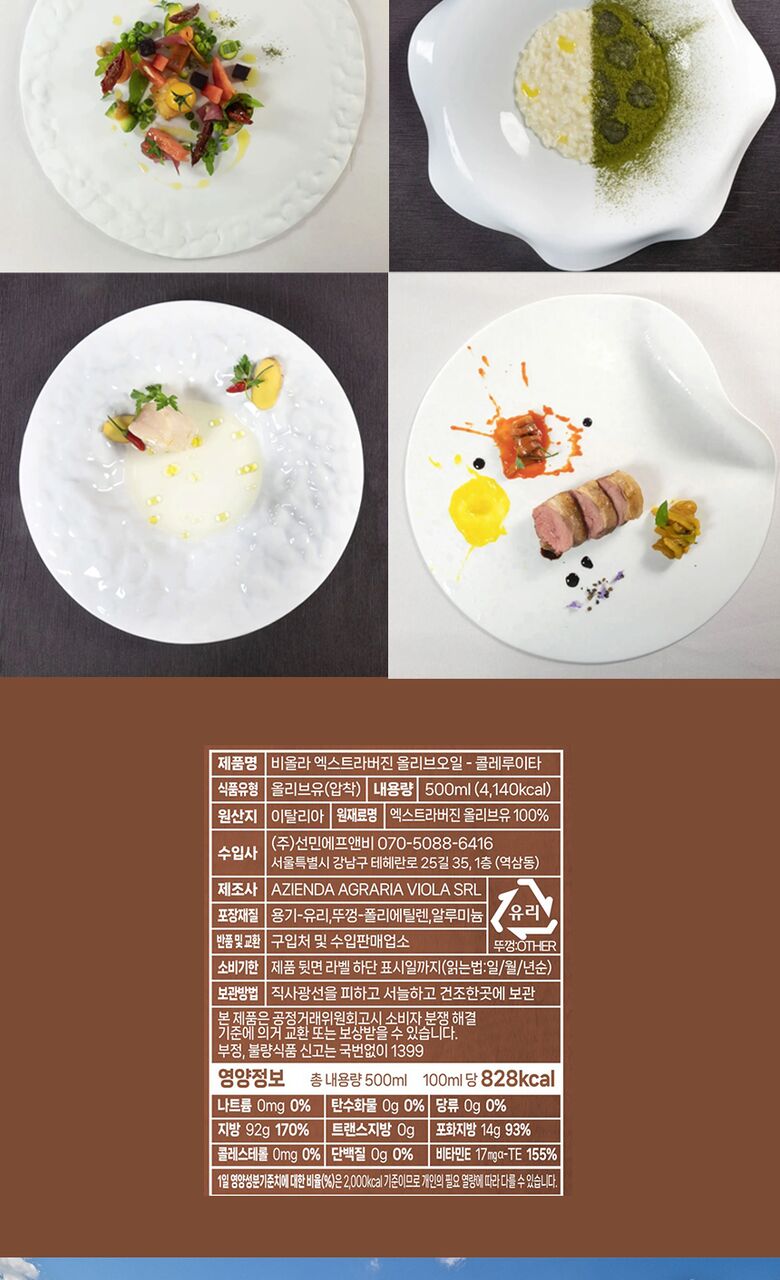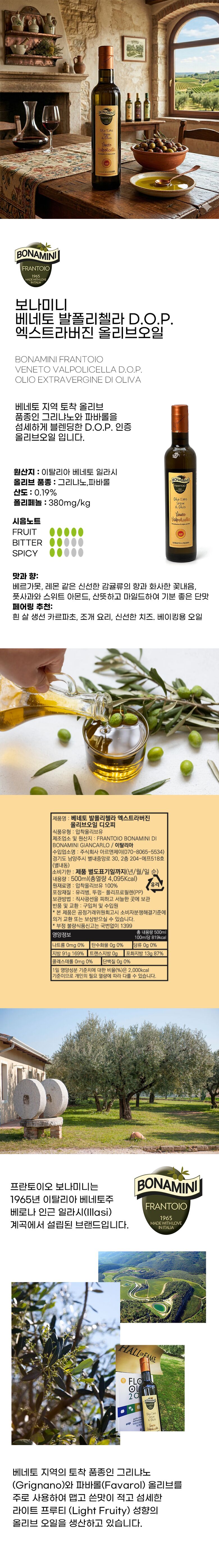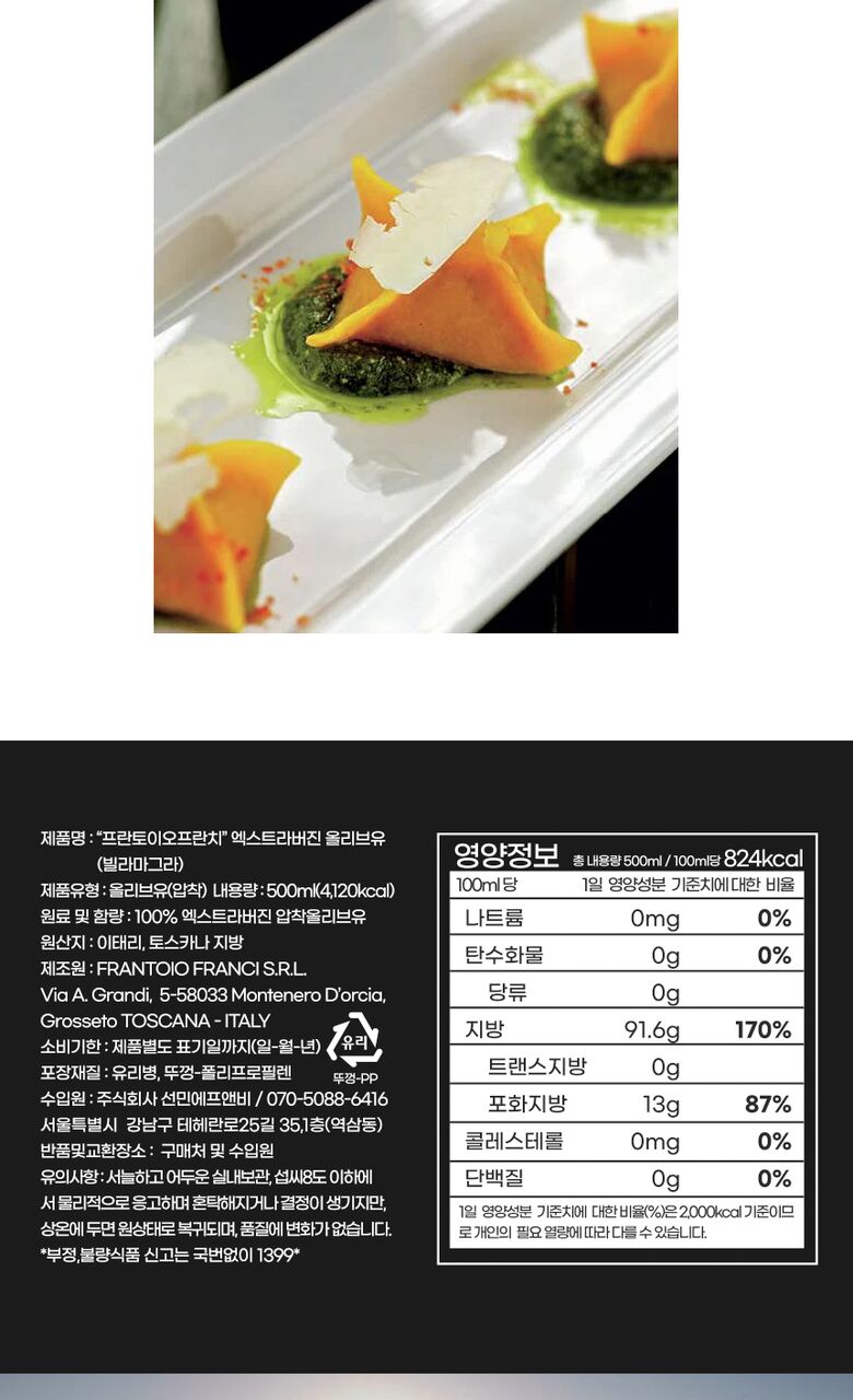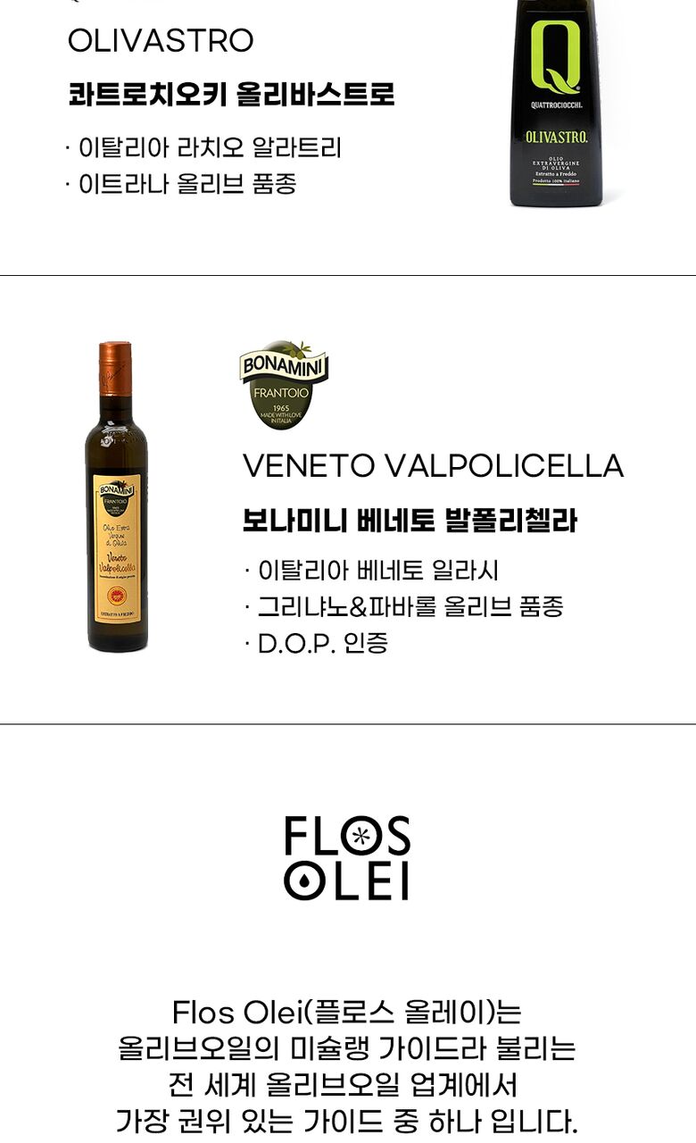 | 원재료명 및 함량(원산지) | 프란치(이탈리아) : 100% 엑스트라버진 압착올리브유, 비올라(이탈리아) : 엑스트라버진 압착 올리브유 100%, 콰트로치오키(이탈리아) : 올리브유 100%, 보나미니(이탈리아) : 압착올리브유 100% |