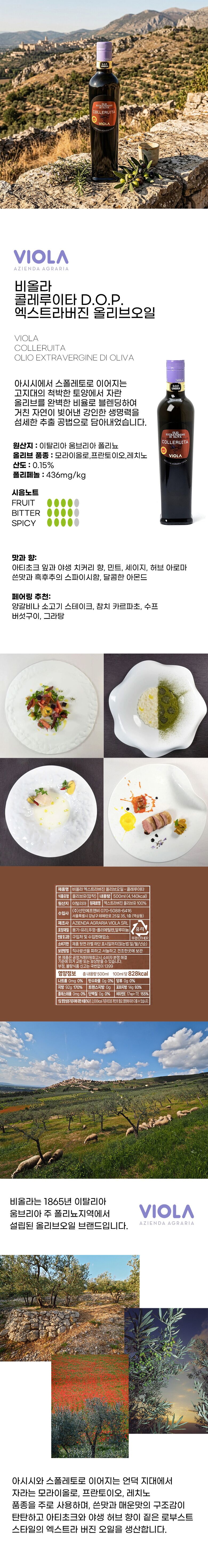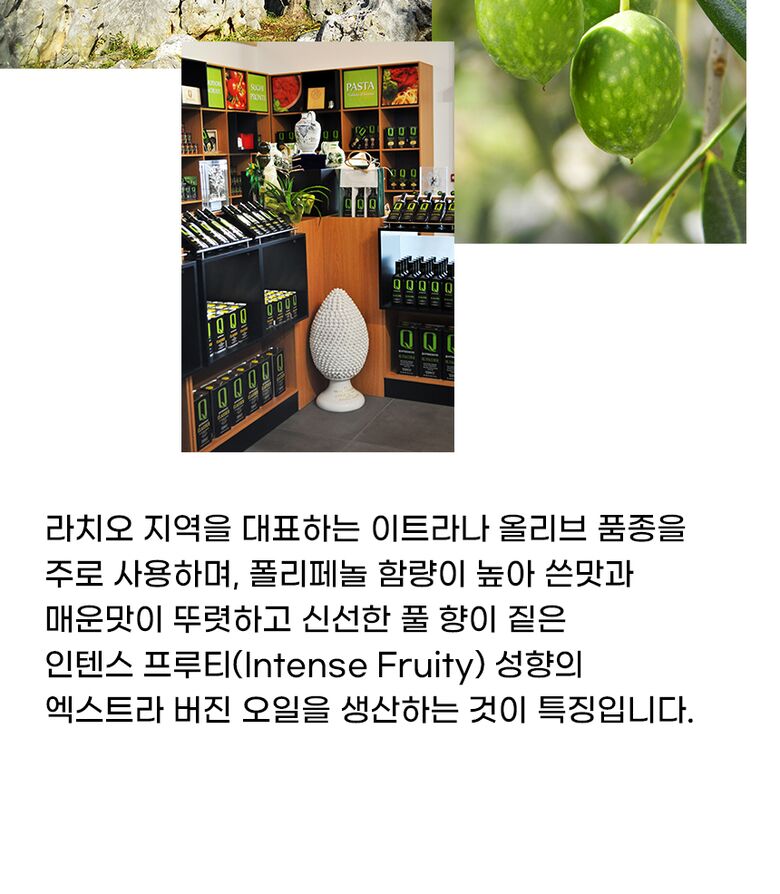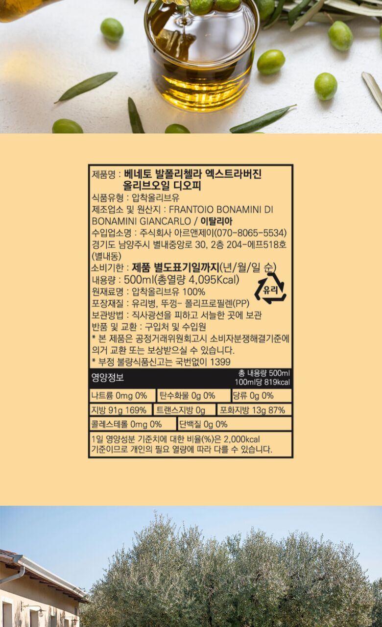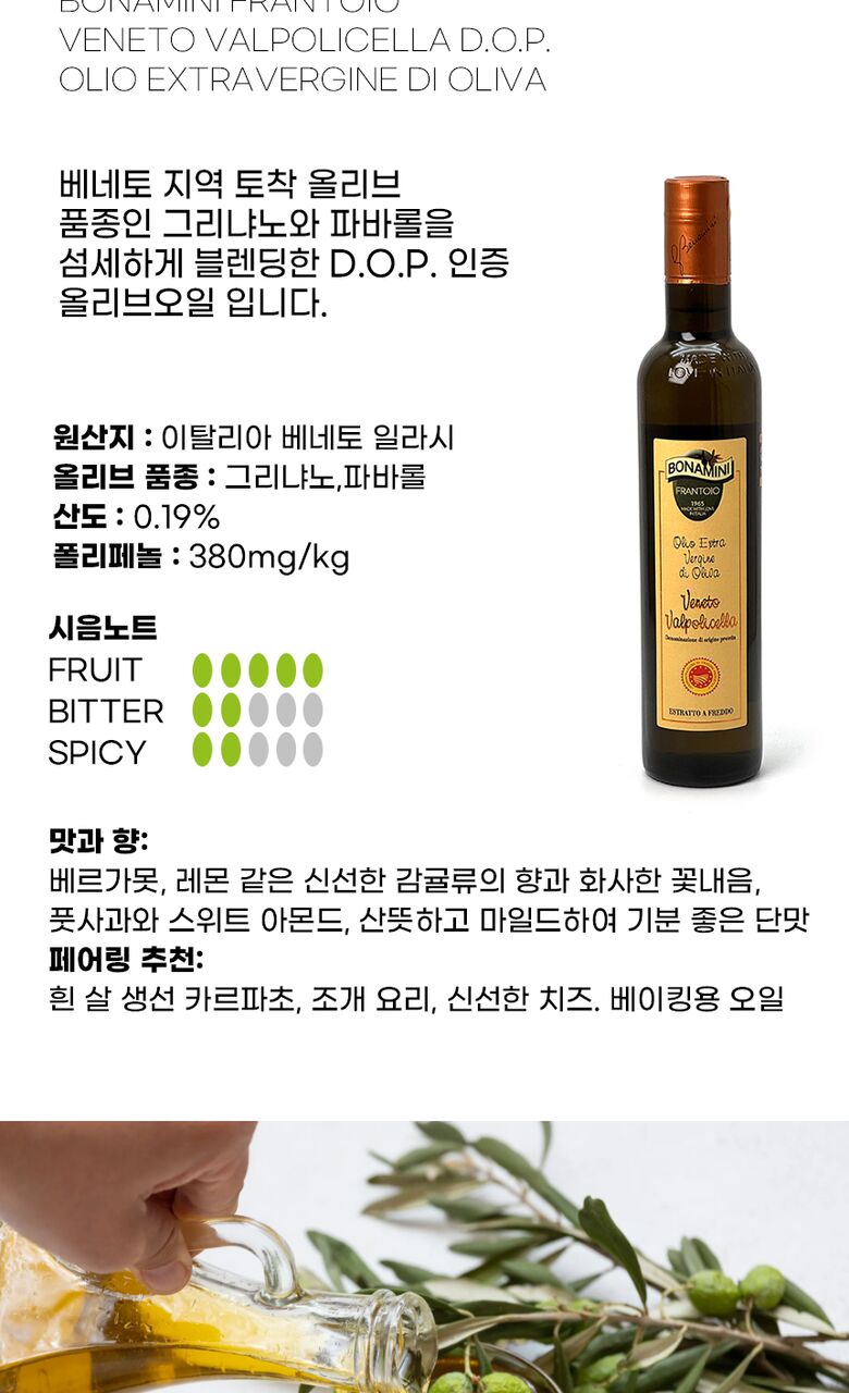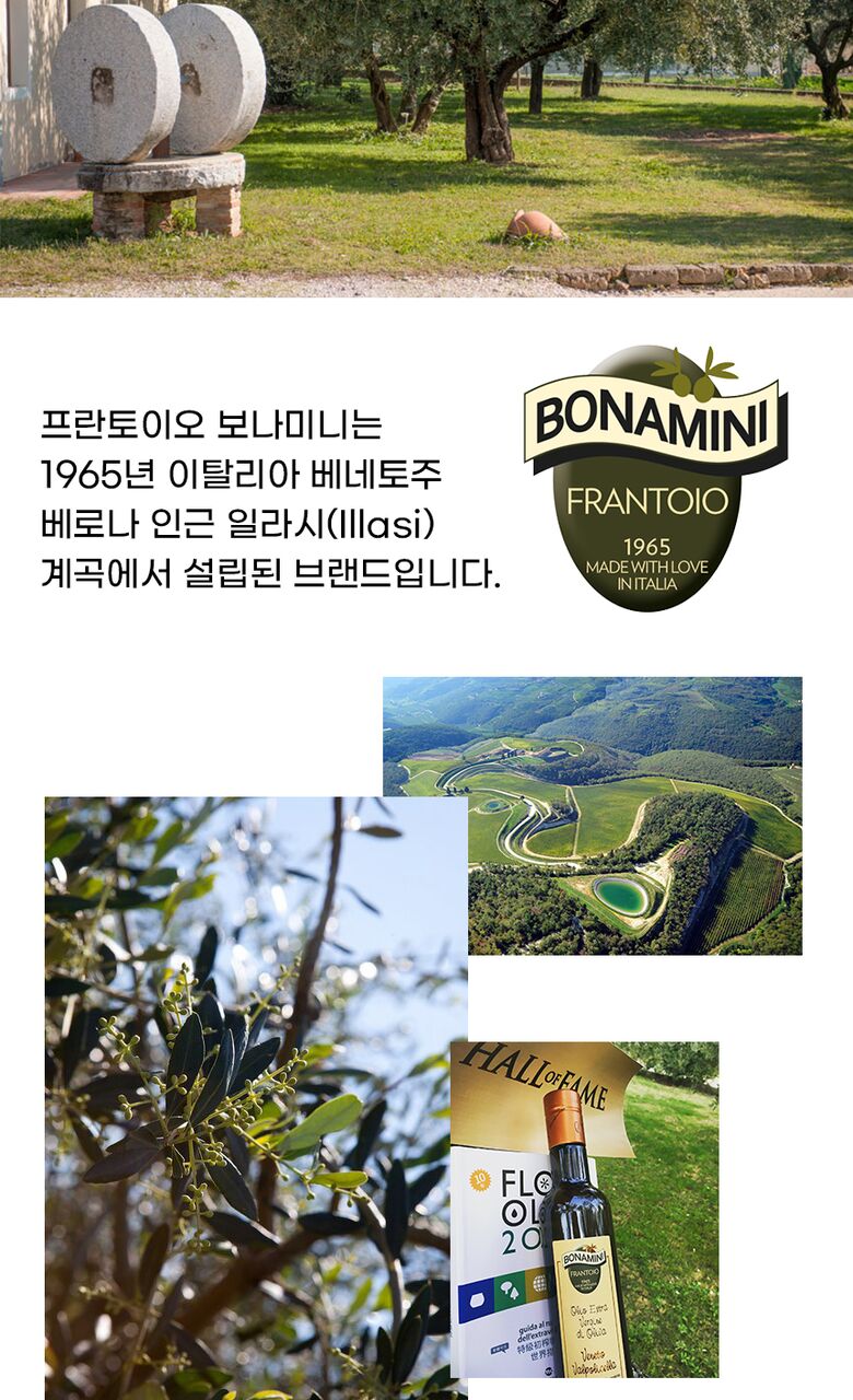 | 원재료명 및 함량(원산지) | 프란치(이탈리아) : 100% 엑스트라버진 압착올리브유, 비올라(이탈리아) : 엑스트라버진 압착 올리브유 100%, 콰트로치오키(이탈리아) : 올리브유 100%, 보나미니(이탈리아) : 압착올리브유 100% |