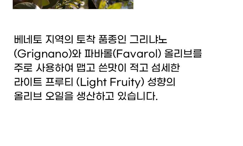 | 제품명 | “프란토이오프란치” 엑스트라버진 올리브유(빌라마그라),비올라 엑스트라버진 올리브오일-콜레루이타, 콰트로치오키 올리바스트로 엑스트라버진 올리브오일, 베네토 발폴리젤라 엑스트라버진 올리브오일 디오피 |