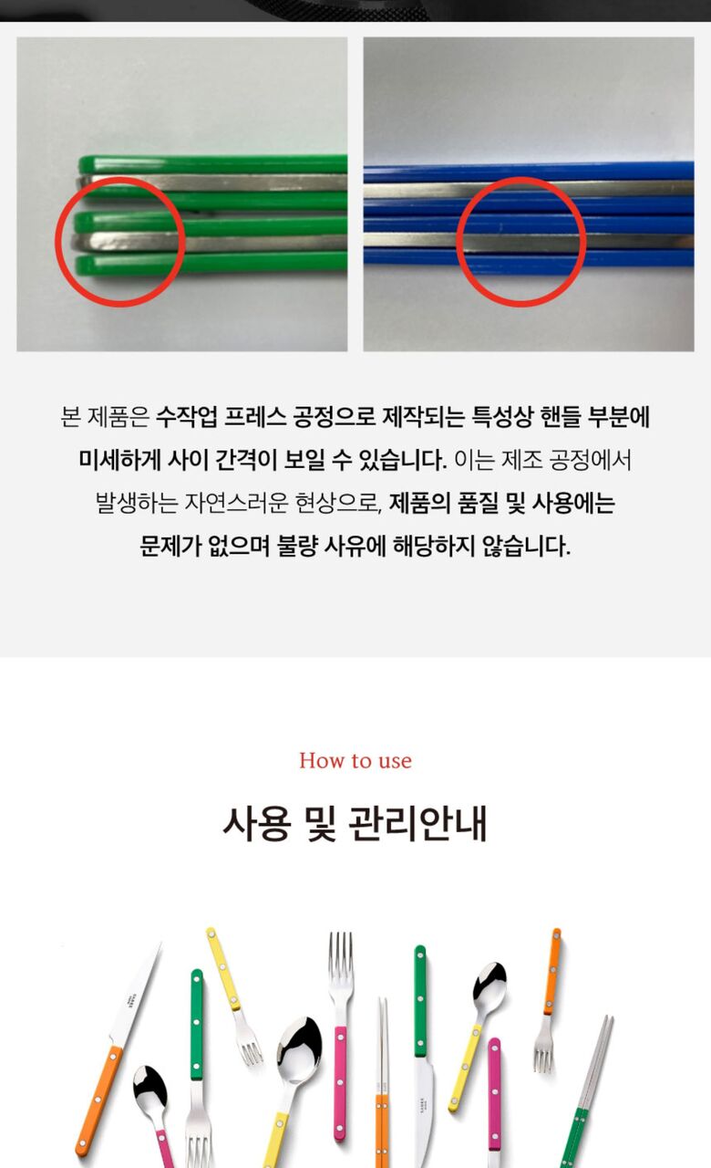 -손잡이가 밝은 컬러의 경우 착색식품(차, 커피, 토마토소스, 카레 등)과 장기간 접촉을 피해 사용하시길 바랍니다.