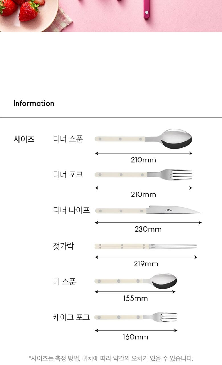 | 크기 | [커트러리] 디너 스푼 210mm, 디너 포크 210mm, 디너 나이프 230mm, 젓가락 219mm, 티스푼 155mm, 케이크 포크 160mm [유리자] 500ml: 108x109mm 750ml: 108x145mm |