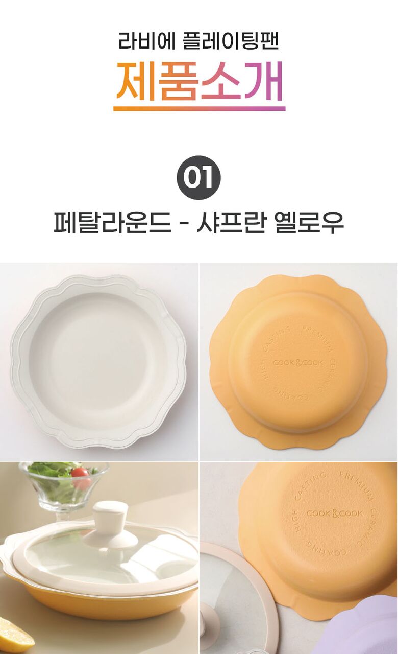 [쿡앤쿡]★단독★ 라비에 IH 플레이팅팬 4종 세트 (페탈 라운드(옐로우)+페탈 스퀘어(라벤더)+유리뚜껑(원형+노브포함)+실리콘 손잡이)