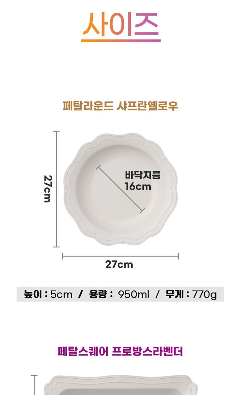 | 크기 | 1. 페탈라운드(샤프란옐로우) : 지름 27cm, 높이 5cm, 용량 950ml 2. 페탈스퀘어(프로방스라벤더) : 가로31.5cm, 세로 25.5cm, 높이 5cm, 용량 1,468ml |