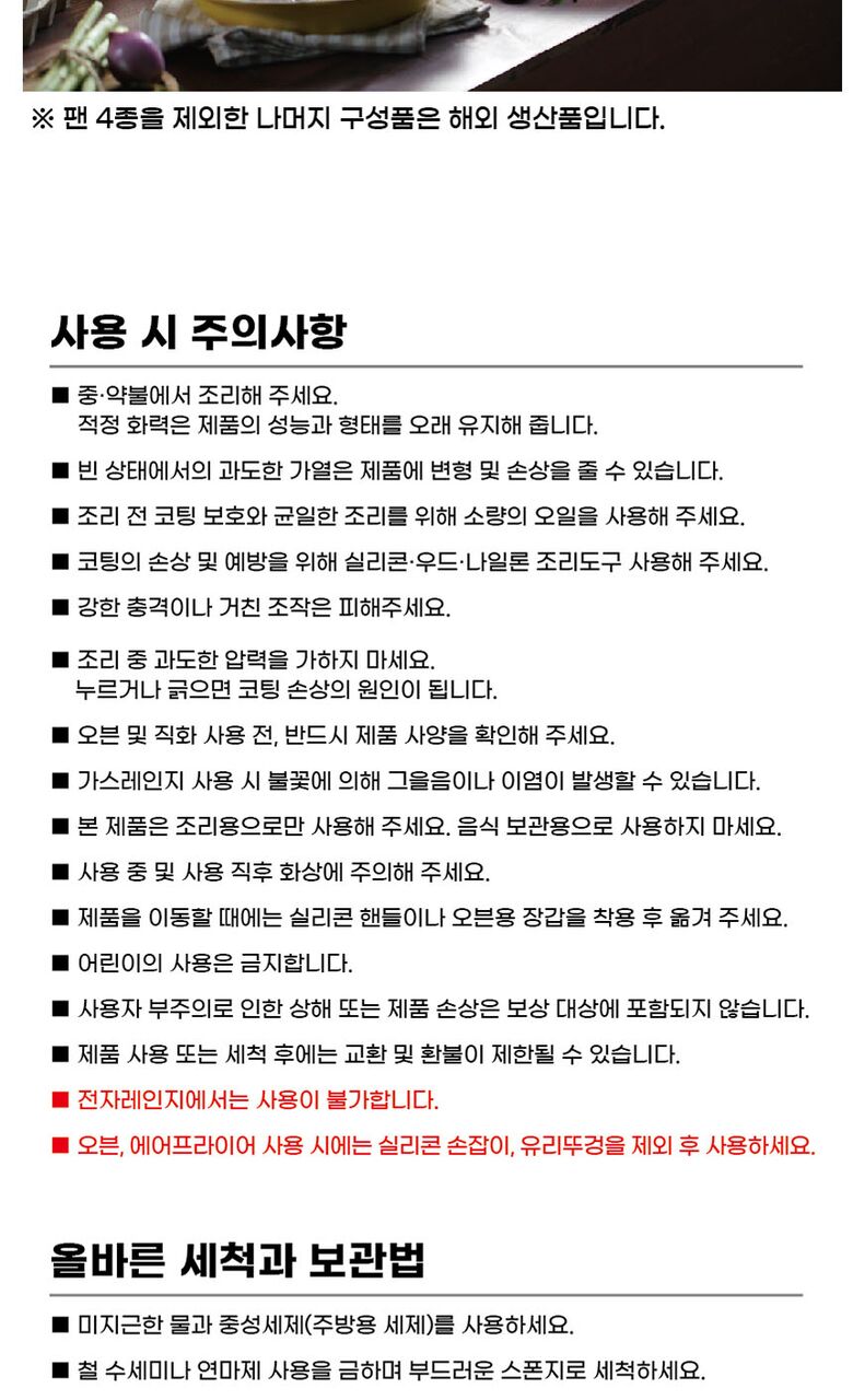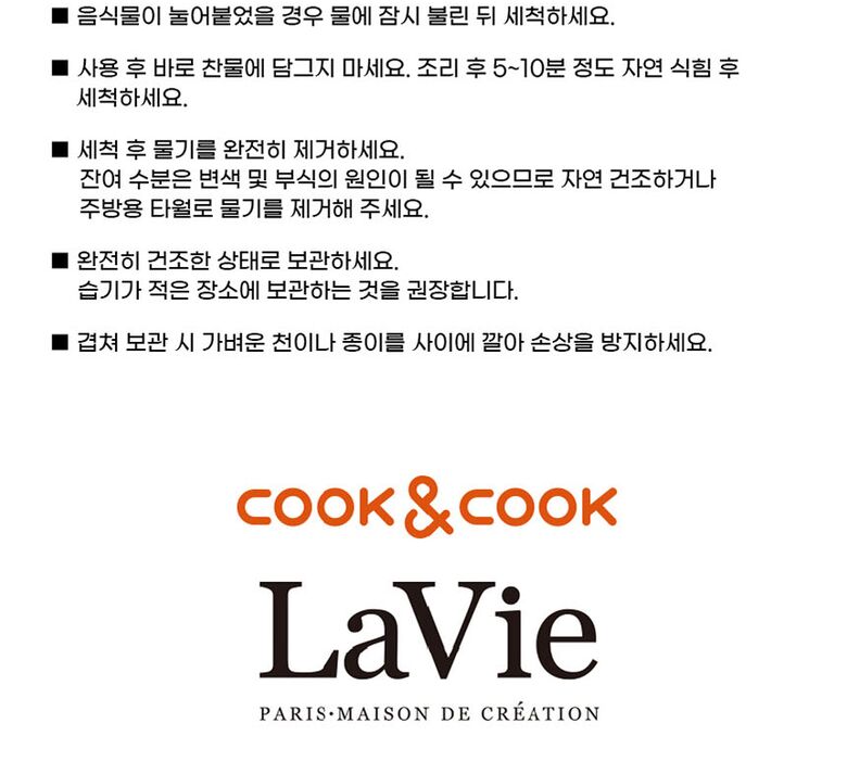 - 제품을 포개어 보관할 경우 코팅 보호를 위해 부드러운 천이나 종이를 사이에 두는 것을 권장합니다.