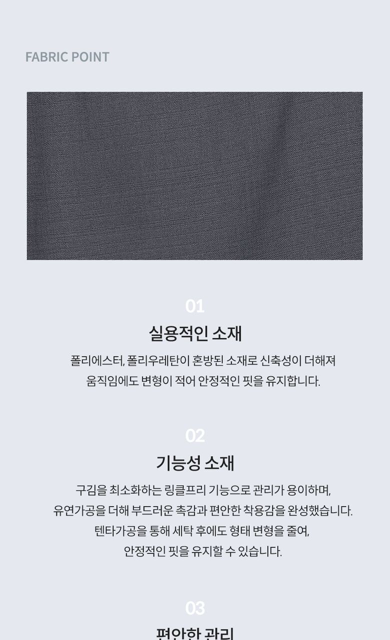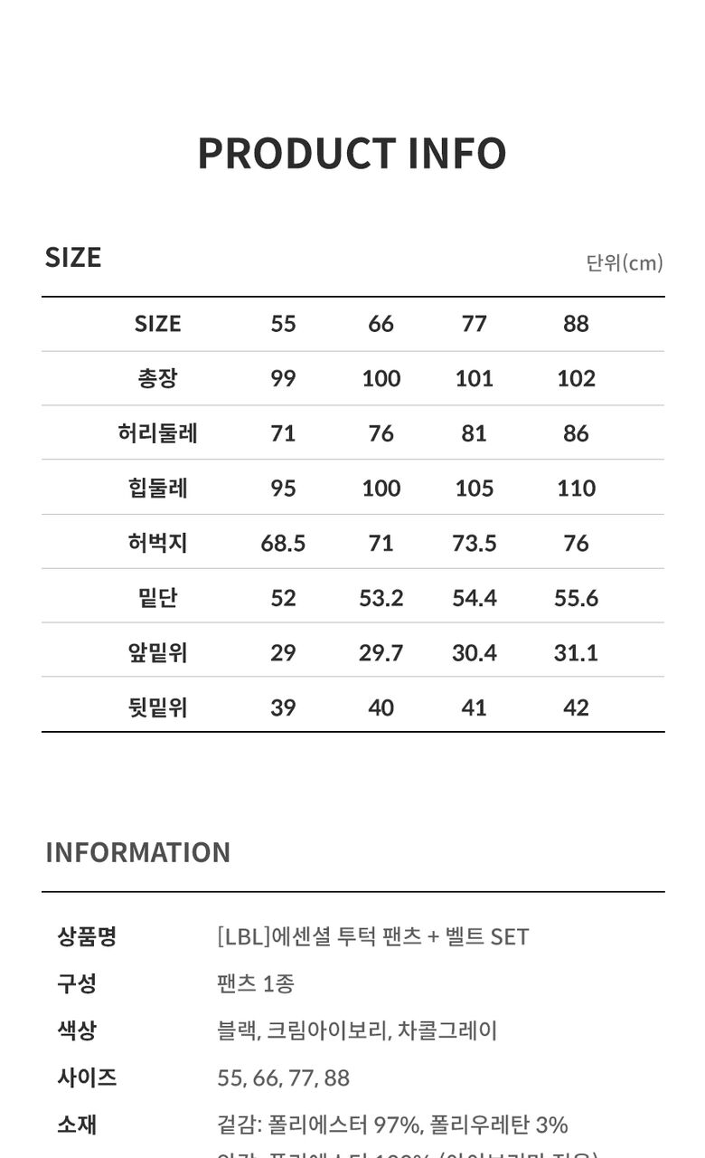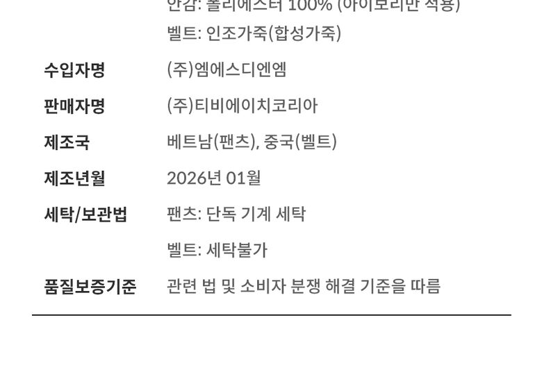| 제품소재 | 겉감 : 폴리에스터 97%, 폴리우레탄 3% 안감 : 폴리에스터 100% (아이보리만 적용) 벨트 : 가죽제품 (합성가죽) |