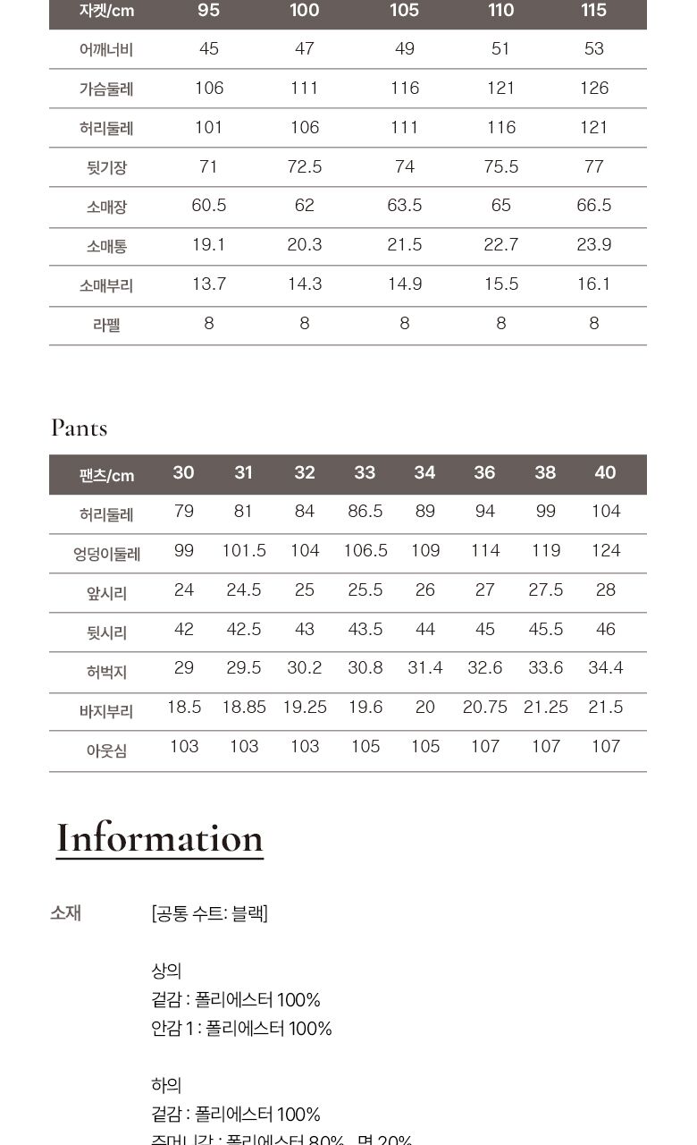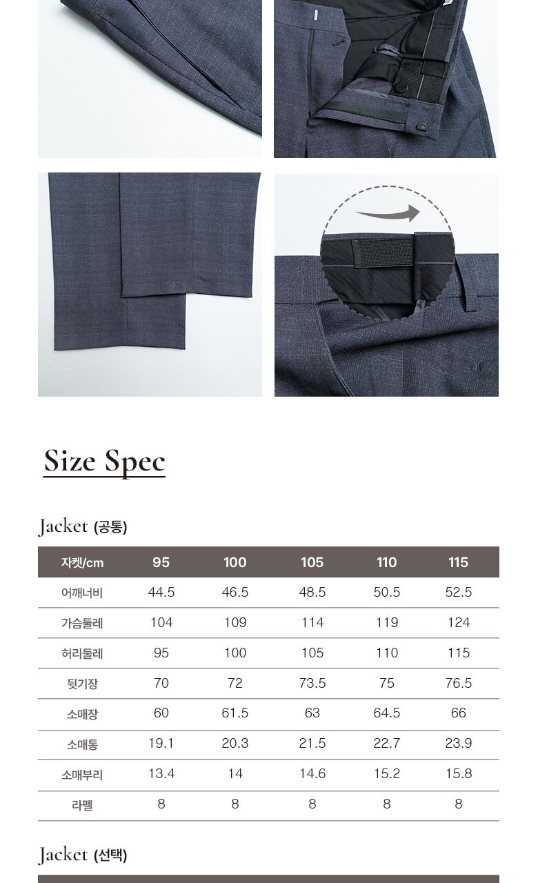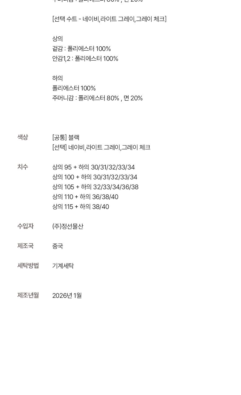 | 제품소재 | [공통 수트] 상의 겉감 : 폴리에스터 100% 안감 1,2 : 폴리에스터 100%하의 겉감 : 폴리에스터 100% 주머니감 : 폴리에스터 80% , 면 20% [선택 수트] 상의 겉감 : 폴리에스터 100% 안감1,2 : 폴리에스터 100%하의 겉감 : 폴리에스터 100% 주머니감 : 폴리에스터 80% , 면 20% |