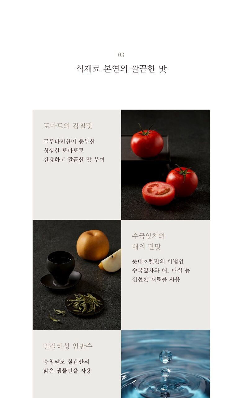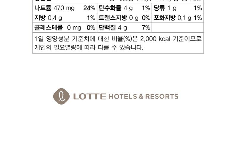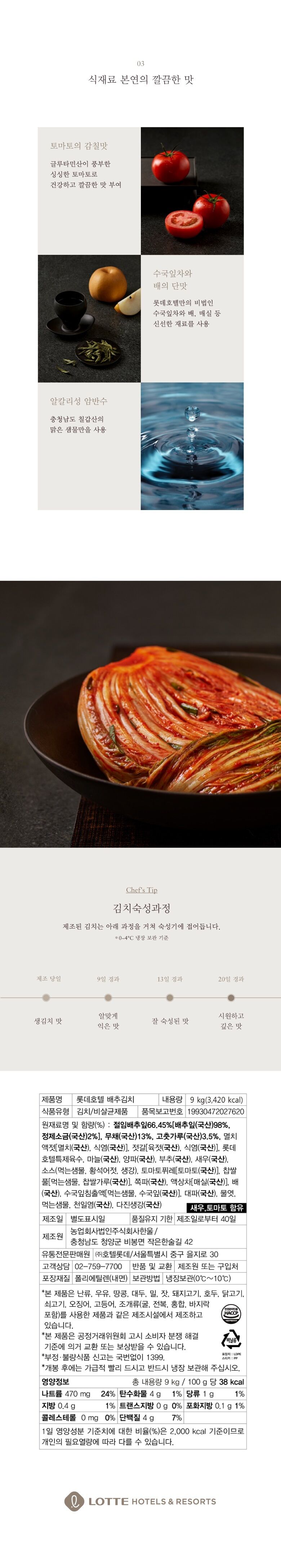 | 원재료명 및 함량(원산지) | ㅁ롯데호텔 배추김치 : 절임배추잎66.45%[배추잎(국산)98.0%, 정제소금(국산)2.0%], 무채(국산)13%, 고춧가루(국산)3.5%, 멸치액젓[멸치(국산),식염(국산)], 젓갈[육젓(국산),식염(국산)], 롯데호텔특제육수, 마늘(국산), 양파(국산), 부추(국산), 새우(국산), 소스(먹는샘물, 황석어젓, 생강), 토마토퓌레(토마토(국산)], 찹쌀풀[먹는샘물, 찹쌀가루(국산)], 쪽파(국산), 액상차[매실(국산)], 배(국산), 수국잎침출액[먹는샘물, 수국잎(국산)], 대파(국산), 물엿, 먹는샘물, 천일염(국산), 다진생강(국산) *새우, 토마토 함유 |
