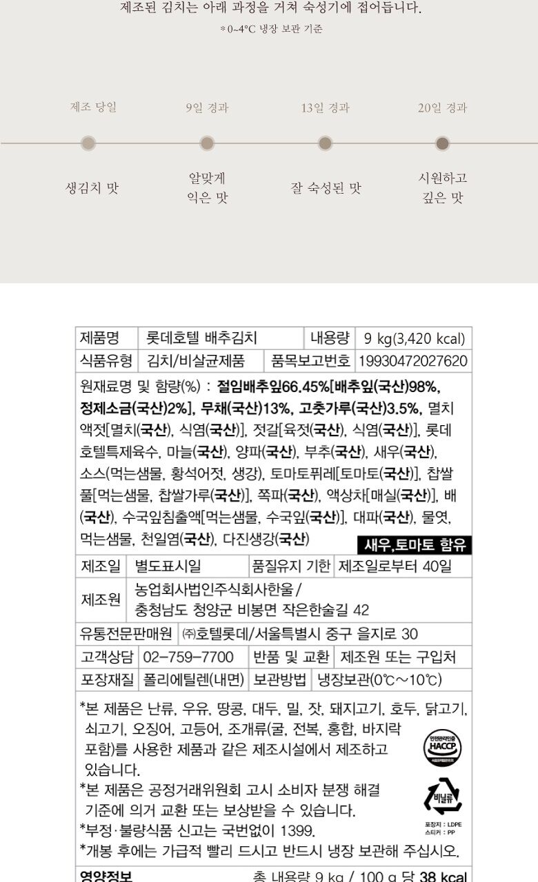 | 포장단위별 내용물의 용량(중량), 수량 | 롯데호텔 배추김치 9kg |