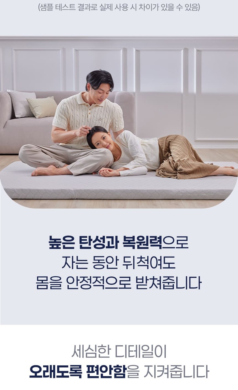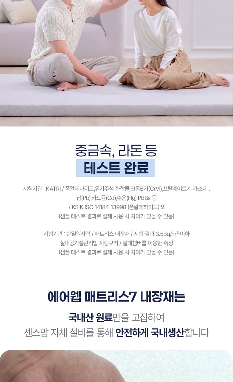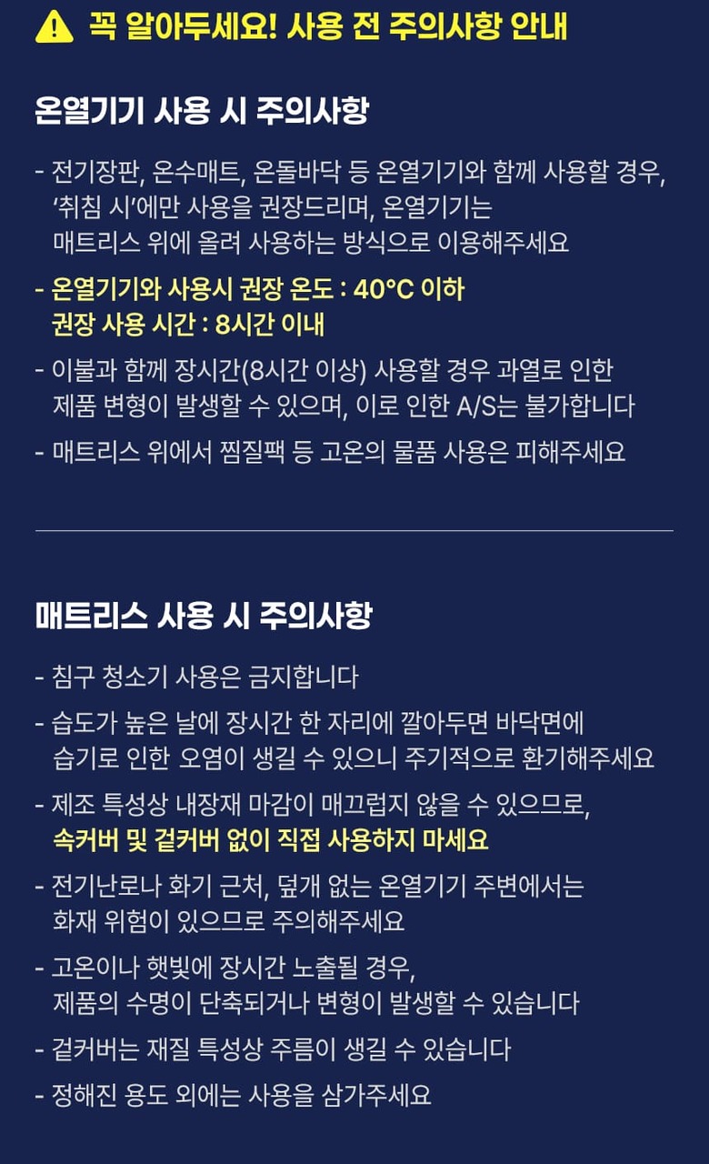 - 전기장판, 온수매트, 온돌바닥 등 온열기기와 함께 사용할 경우, '취침 시'에만 사용을 권장드리며 온열기기는 매트리스 위에 올려 사용하는 방식으로 이용해주세요.