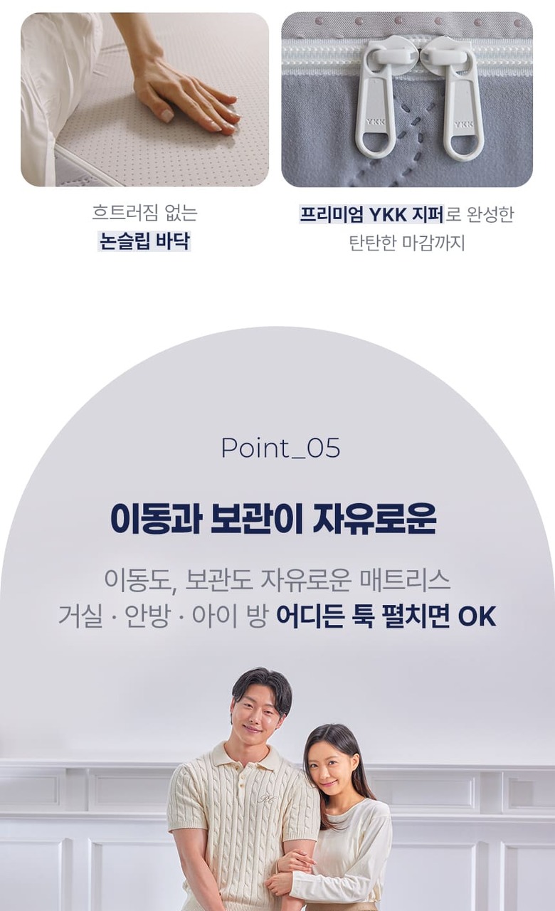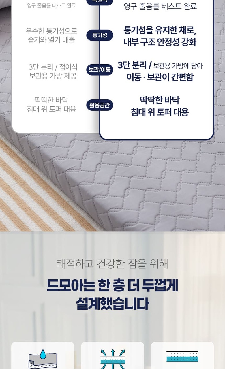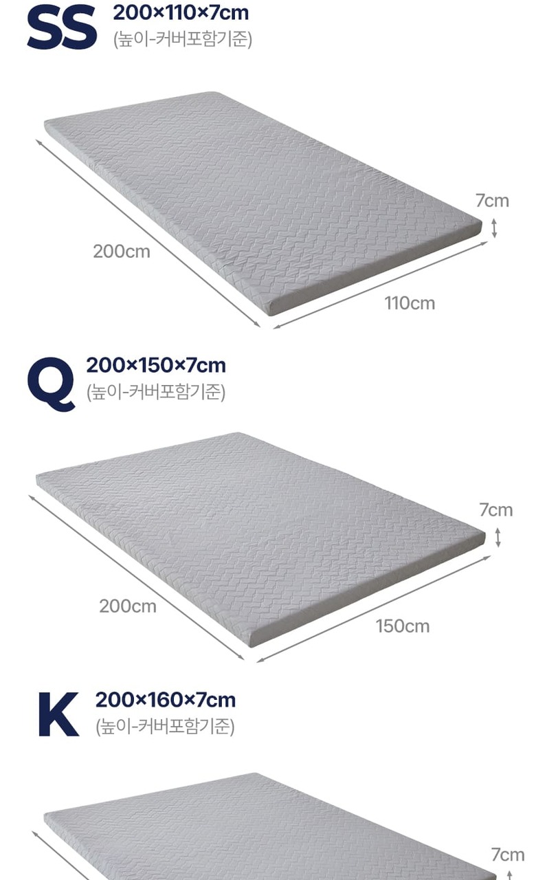 | 제품구성 | 매트1(3단분리 1set) , 속커버1 (하드/소프트 색상구분)( 3단분리 각1장씩 총 3장 1set ), 겉커버1 (다크그레이 or 라이트그레이 택1), 보관용 가방1 |