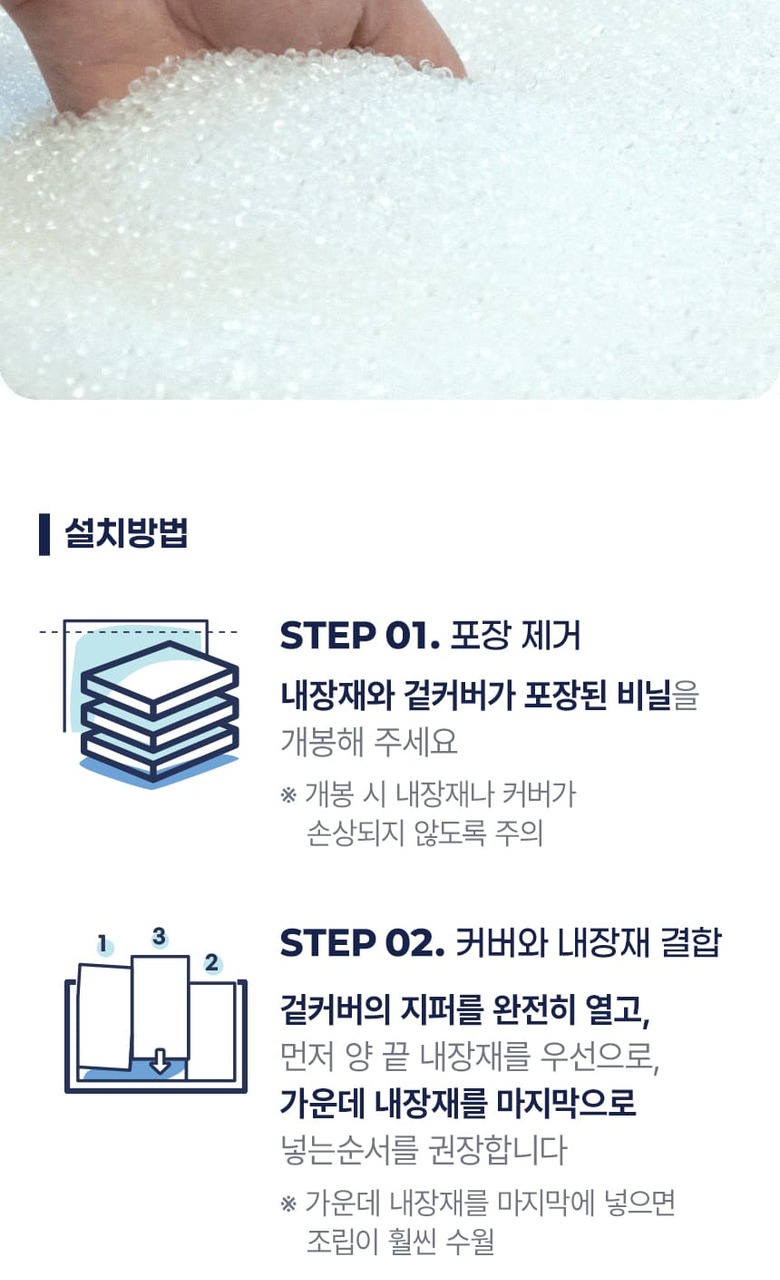 - 제조 특성상 내장재 마감이 매끄럽지 않을 수 있으므로, 속커버 및 겉커버 없이 직접 사용하지 마세요.