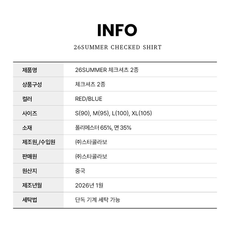 | 셔츠 2종 | S(90) / M(95) / L(100) / XL(105) | 2 |
