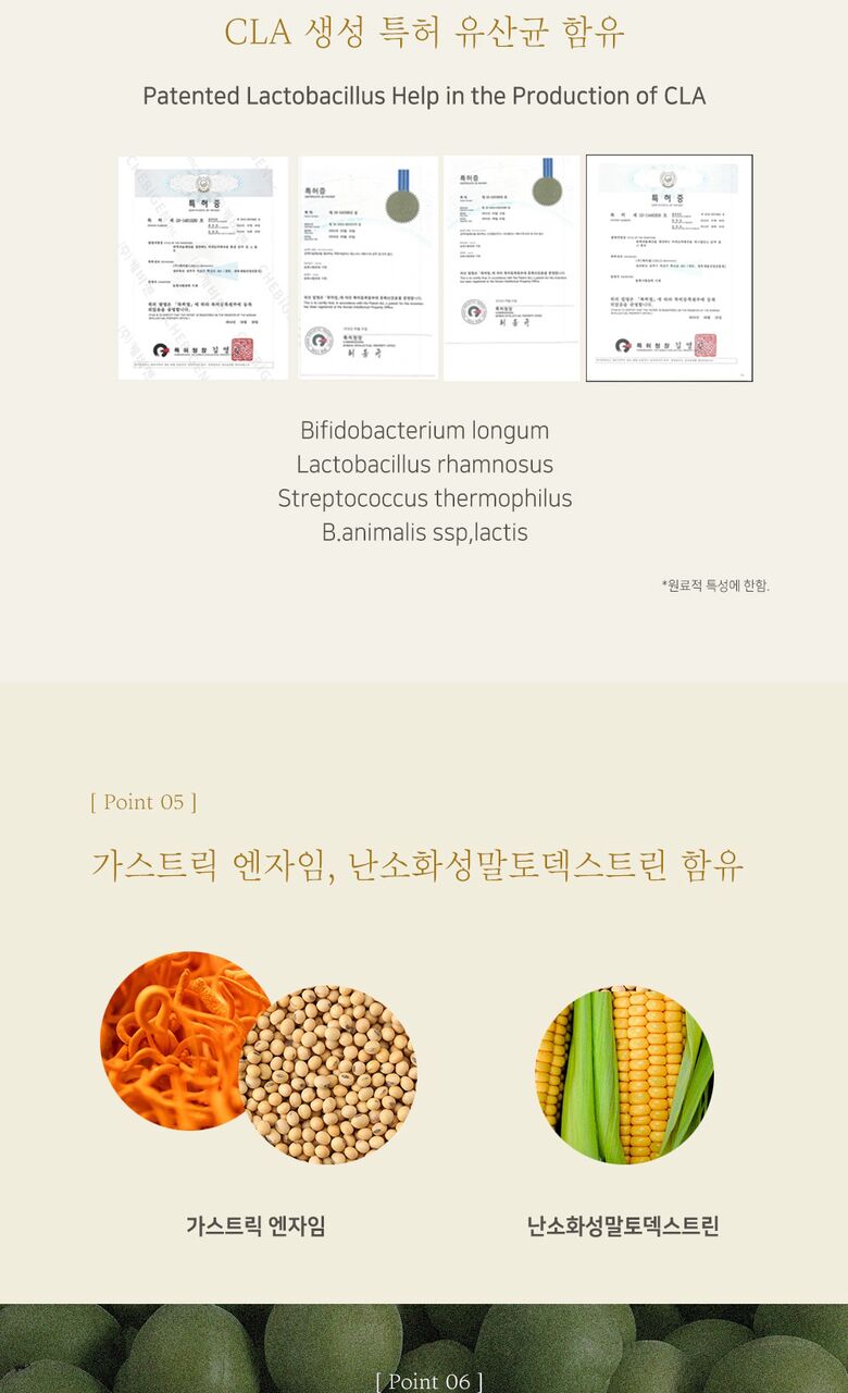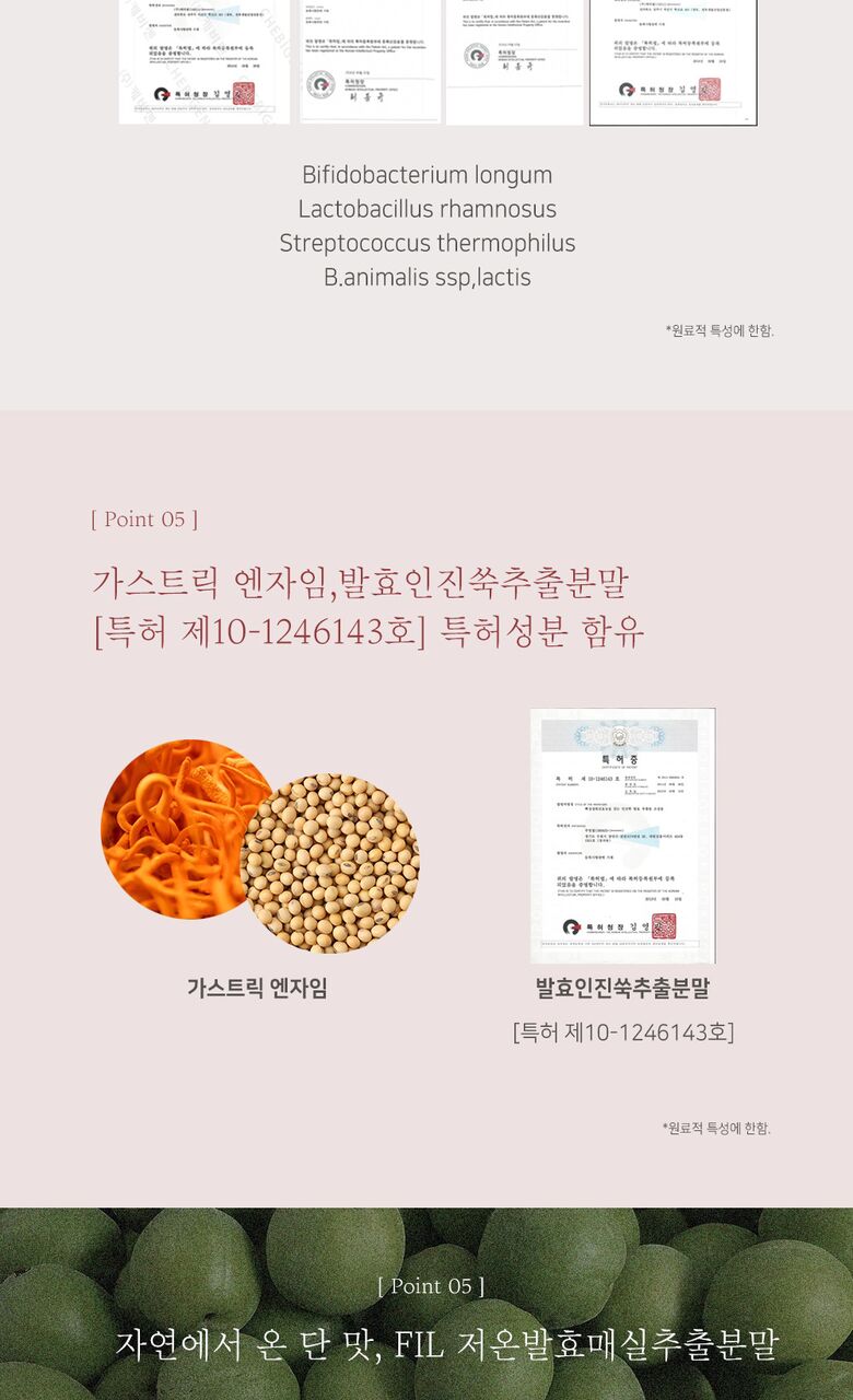 | 원재료명 및 함량(원산지) | ABC ABC분말[사과농축분말{사과농축액(고형분:10%)(사과:국산)}, 당근착즙액분말{당근착즙액(당근100%:국산)}, 레드비트농축분말{레드비트농축액(고형분:17%)(레드비트농축액:독일산)] 16.54%, 사과농축분말{덱스트린, 사과농축액(사과100%:국산)} 15.5%, 사과맛분말{결정과당, 포도당, 사과농축분말(사과농축액<사과100%:국산>), 혼합제제(덱스트린, 향료, 아라비아검), 이산화규소, 정제소금(국산)} 15.5%, FIL퓨어자임[V3발효곡물{현미(국산)}, V5발효곡물{곡류혼합분말(흰콩<국산>)}] 12%, 유함유가공품{분리유청단백, 대두레시틴} 9.49%, 볶은현미분말 6%, 볶은흰콩분말 6%, 사과초모식초분말 4%, 아가베이눌린 3.6%, FIL발효과채곡물 2%, 가스트릭엔자임 1%, 발효인진쑥추출분말 1%, 혼합제제(덱스트린, 향료, 아라비아검) 1%, 효소처리스테비아 0.3%, CLA생성혼합유산균 0.07% 레몬 레몬농축분말{레몬과즙농축액(아르헨티나산), 덱스트린, 아라비아검} 19%, 레몬맛분말[설탕, 덱스트린, 혼합제제{덱스트린, 레몬오일(천연향료), 아라비아검, 구연산, 팩틴, 구연산삼나트륨}, 구연산, 레몬과즙분말{덱스트린, 레몬과즙(미국산)}, 포도당 이산화규소, 정제소금(국산), 카복시메티셀룰로스나트륨] 15.3%, 프락토올리고당 15%, FIL퓨어자임{곡류혼합발효분말(현미/국산, 흰콩/국산, 귀리/캐나다사느 Aspergillus oryzae), 곡류혼합효소분말(흰콩/국산, 약콩/국산, 귀리/캐나다산, 블랙보리/국산, 현미/국산, Aspergilluseniger, Aspergillus oryzae발효분말)} 12%, 분리유청단백분말(분리유청단백, 대두레시틴) 12%, 난소화성말토덱스트린 7%, 레몬밤추출분말(레몬밥추출액, 덱스트린) 5%, 유기농아가베이눌린분말 4.84%, 레몬향분말{덱스트린, 레몬오일(천연향료), 아라비아검, 팩틴, 구연산삼나트륨} 2.5%, FIL발효과채곡물(흰강낭콩, 19곡혼합분말, 27종 과일야채혼합농축분말) 1%, 대체콜라겐 식물성 GPH 1%, 가스티릭 엔자임 1%, 엔자임믹스파우더 1%, 멀티비타민미네랄믹스-1[퓨라칼(글루콘산칼슘, 젖산칼슘), 비타민C, 비타민E 혼합제제(디엘알파초산토코페롤, 변성전분, 포도당시럽분말, 이산화규소), 글루콘산아연, 푸마르산제일철, 니코틴산아미드, 비타민B6염산염, 비타민B1염산염, 비타민A혼합제제{포도당시럽분말, 아라비아검, 옥수수전분, 비타민A아세테이트, 디엘알파토코페롤}, 비타민B2엽산] 1%, FIL식물성유산균 1%, FIL저온발효매실추출분말 1%, 효소처리스테비아 0.3%, CLA생성혼합유산균 0.06% 카라멜쿠키 코코넛슈가 32.5%, 치커리뿌리추출물 14.34%, FIL퓨어자임[V3발효곡물{현미(국산)}, V5발효곡물{곡률혼합분말(흰콩<국산>)}] 12.5%, 유함유가공품(미국)(분리유청단백, 대두레시틴) 12%, 기타가공품{유청분말(폴란드), 덱스트린, 가공연유(칠레), 아라비아검, 합성향료} 10%, 당류제로크리머(폴리글리시톨시럽, 식물성경화유지, 농축우유단백분말, 제이인산칼륨, 폴리인산칼륨) 7.5%, 혼합제제(카라멜쿠키분말향:포도당, 프로필렌글리콜, 주정, 정제수, 합성향료, 천연향료, 트리아세틴) 6%, 대나무수액추출분말 2%, 엔자임믹스파우더 0.5%, FIL식물성유산균 0.5%, FIL저온발효매실추출분말 0.5%, 발효인진쑥추출분말 0.5%, 발효자몽농축분말 0.5%, 가스트릭엔자임 0.5%, 시나몬카라멜쿠키 0.1%, CLA생성혼합유산균 0.06% |