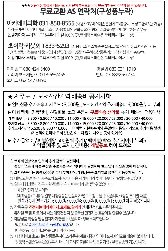 주의사항: 상품특성(설치상품, 상품크기, 일부 저단가 상품 등) 또는 지역여건(산간, 도서지역)에 따라 배송이 지연되거나 추가 배송비가 발생할 수 있습니다.