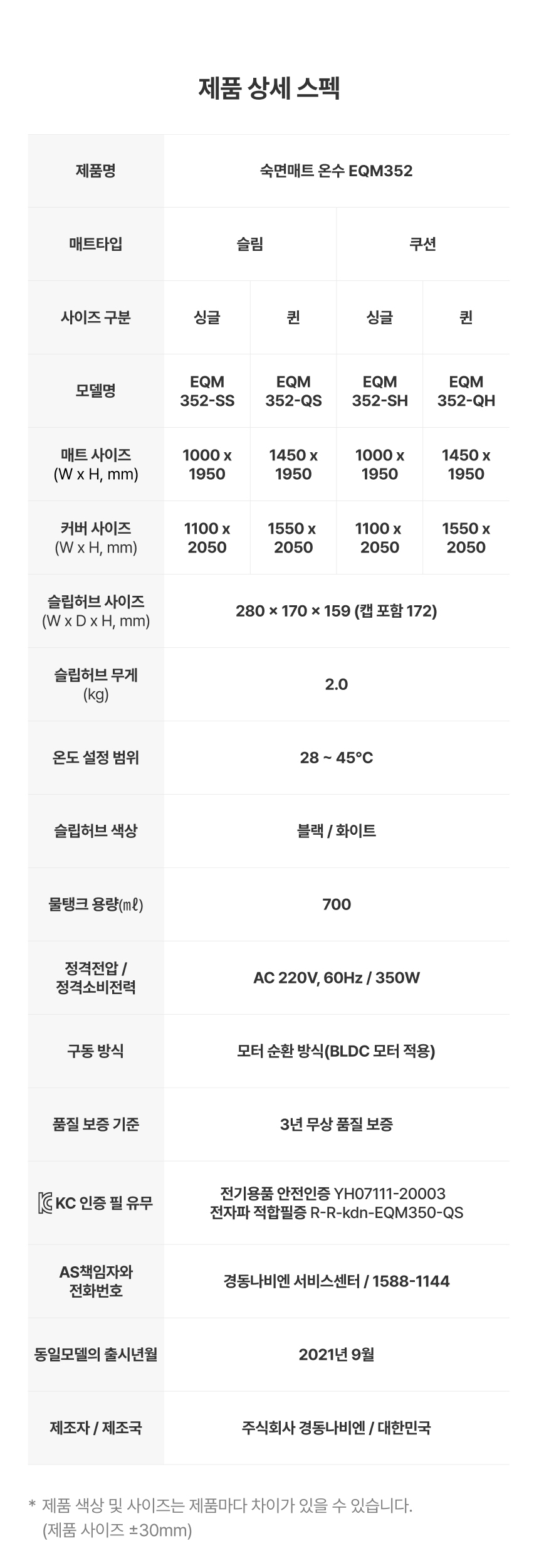 | 품명 / 모델명 | New Simple 온수매트 쿠션형 매트 싱글 EQM352-QH |
