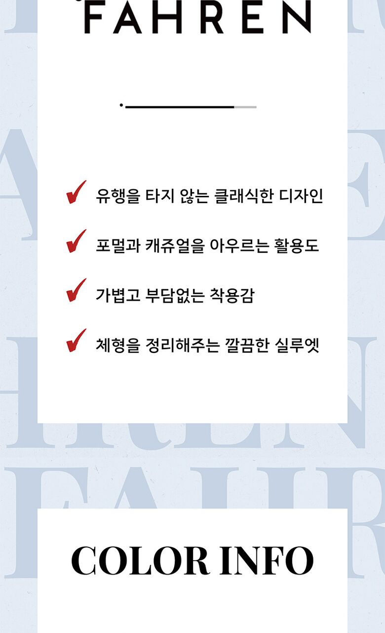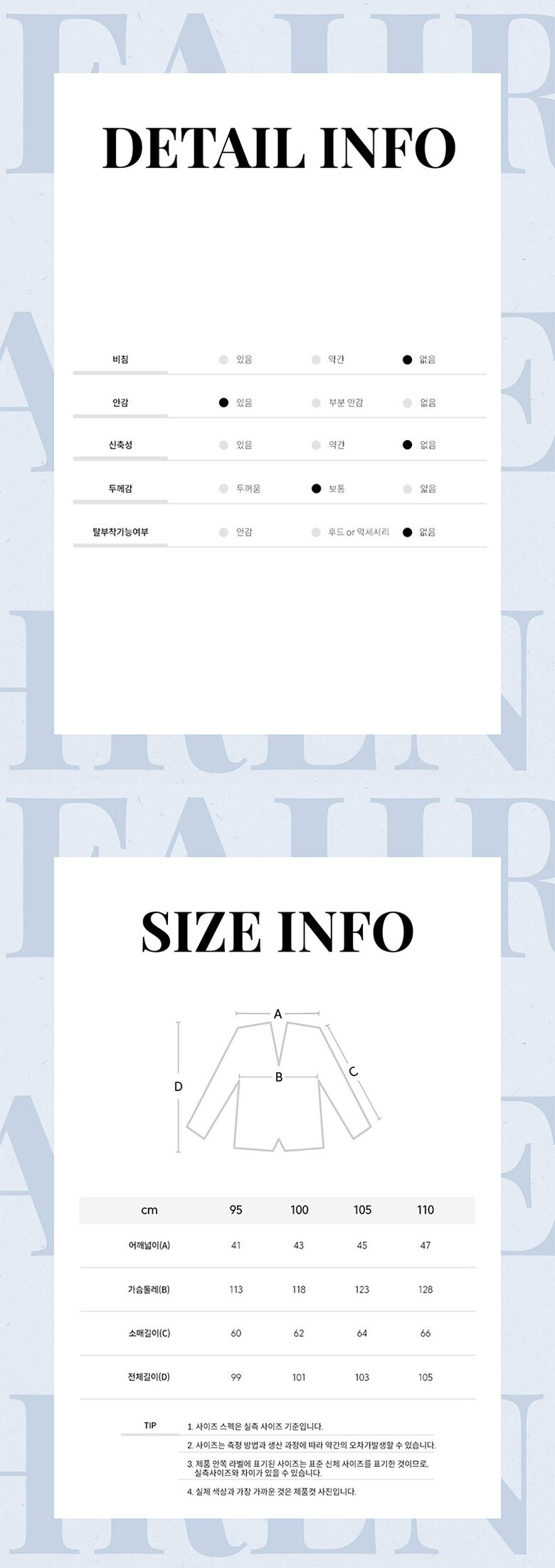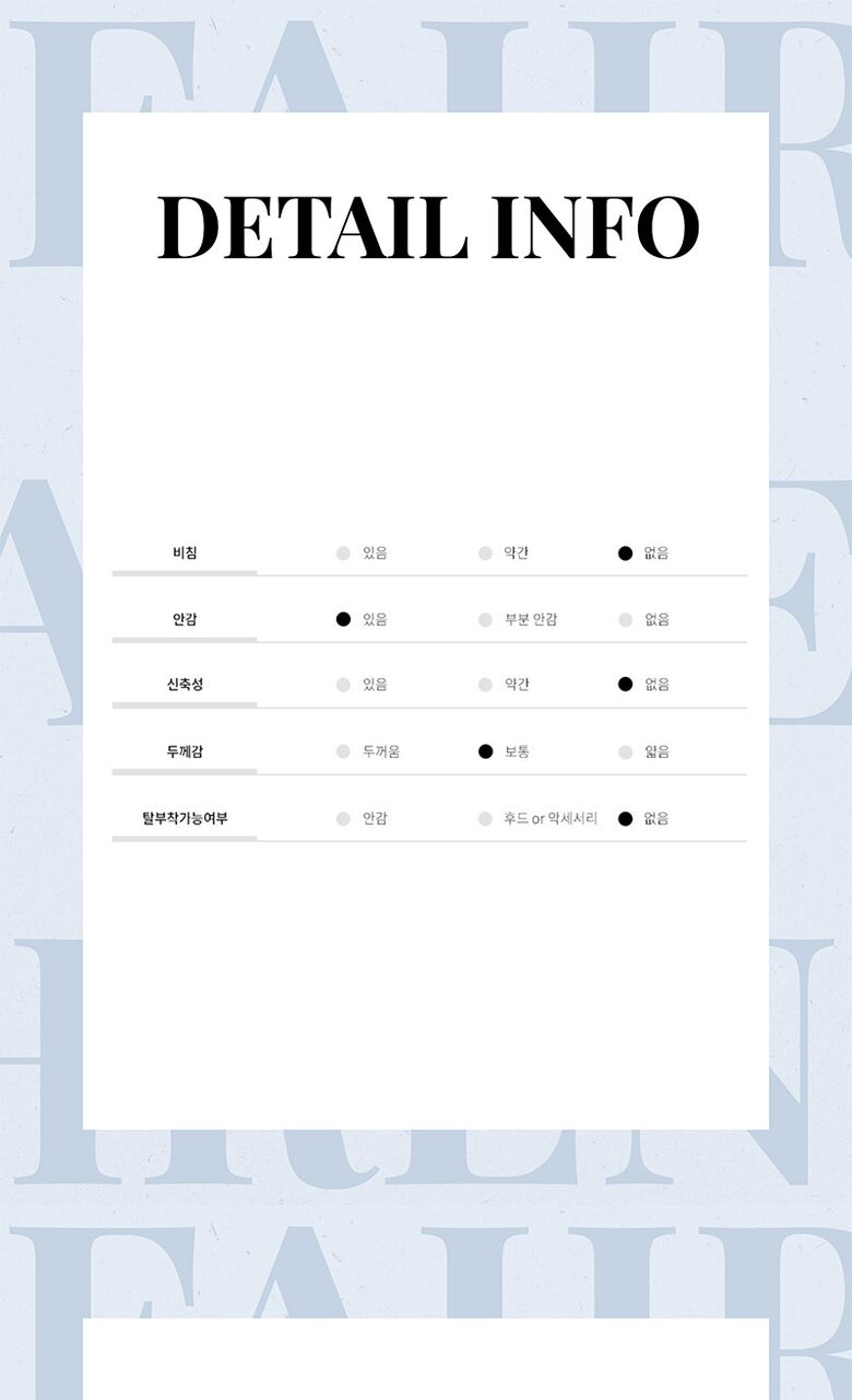 | 제품소재 | 겉감 : 폴리에스터 100% 안감: 폴리에스터 : 100% |